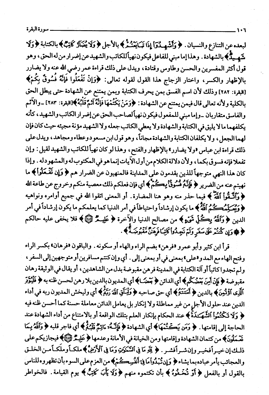 قرأ ابن كثير وأبو عمرو «فرهن» بضم الراء والهاء أو سكونه. والباقون «فرهان» بكسر الراء وفتح الهاء مع المد و «على» بمعنى في أو بمعنى إلى. أي وإن كنتم مسافرين أو متوجهين إلى السفر، ولم تجدوا كاتبا أو آلة الكتابة في المدينة فرهن مقبوضة بدل من الشاهدين، أو يقال في الوثيقة رهان مقبوضة فَإِنْ أَمِنَ بَعْضُكُمْ أي الدائن بَعْضاً أي المديون بالدين بلا رهن لحسن ظنه به فَلْيُؤَدِّ الَّذِي اؤْتُمِنَ بالدين أَمانَتَهُ أي حق صاحبه وَلْيَتَّقِ اللَّهَ رَبَّهُ أي وليخش المديون ربه في أداء الدين عند حلول الأجل من غير مماطلة ولا إنكار بل يعامل الدائن معاملة حسنة كما أحسن ظنه فيه وَلا تَكْتُمُوا الشَّهادَةَ عند الحكام بإنكار العلم بتلك الواقعة أو بالامتناع من أداء الشهادة عند الحاجة إلى إقامتها. وَمَنْ يَكْتُمْها أي الشهادة فَإِنَّهُ آثِمٌ قَلْبُهُ أي فاجر قلبه وَاللَّهُ بِما تَعْمَلُونَ من كتمان الشهادة وإقامتها ومن الخيانة في الأمانة وعدمها عَلِيمٌ (283) فيجازيكم على ذلك إن خيرا فخير وإن شرا فشر. لِلَّهِ ما فِي السَّماواتِ وَما فِي الْأَرْضِ ملكا وملكا من الخلق والعجائب يأمر عباده بما يشاء وَإِنْ تُبْدُوا ما فِي أَنْفُسِكُمْ من العزم على السوء بأن تظهروه للناس بالقول أو بالفعل أَوْ تُخْفُوهُ بأن تكتموه منهم وَلا يَأْبَ كاتِبٌ يوم القيامة. فالخواطر