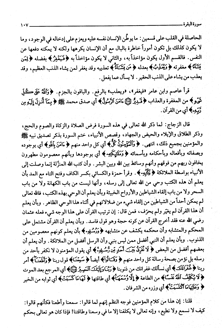 قرأ عاصم وابن عامر «فيغفر» ، «ويعذب» بالرفع. والباقون بالجزم. وَاللَّهُ عَلى كُلِّ شَيْءٍ من المغفرة والعذاب قَدِيرٌ (284) آمَنَ الرَّسُولُ أي صدق محمد صلّى الله عليه وسلّم بِما أُنْزِلَ إِلَيْهِ مِنْ رَبِّهِ أي من القرآن.
