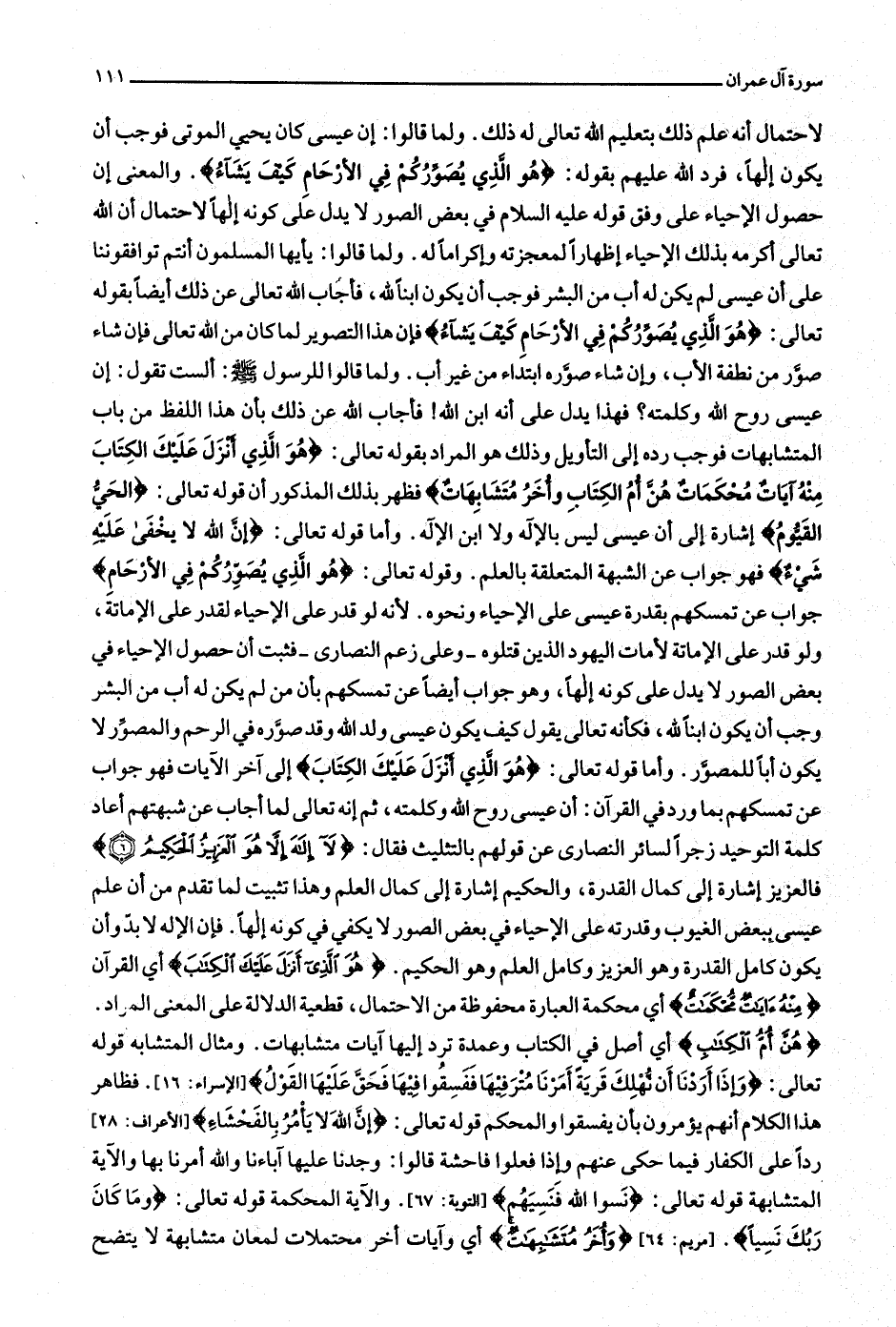 لاحتمال أنه علم ذلك بتعليم الله تعالى له ذلك. ولما قالوا: إن عيسى كان يحيي الموتى فوجب أن يكون إلها، فرد الله عليهم بقوله: هُوَ الَّذِي يُصَوِّرُكُمْ فِي الْأَرْحامِ كَيْفَ يَشاءُ. والمعنى إن حصول الإحياء على وفق قوله عليه السلام في بعض الصور لا يدل على كونه إلها لاحتمال أن الله تعالى أكرمه بذلك الإحياء إظهارا لمعجزته وإكراما له. ولما قالوا: يا أيها المسلمون أنتم توافقوننا على أن عيسى لم يكن له أب من البشر فوجب أن يكون ابنا لله، فأجاب الله تعالى عن ذلك أيضا بقوله تعالى: هُوَ الَّذِي يُصَوِّرُكُمْ فِي الْأَرْحامِ كَيْفَ يَشاءُ فإن هذا التصوير لما كان من الله تعالى فإن شاء صوّر من نطفة الأب، وإن شاء صوّره ابتداء من غير أب. ولما قالوا للرسول صلّى الله عليه وسلّم: ألست تقول: إن عيسى روح الله وكلمته؟ فهذا يدل على أنه ابن الله! فأجاب الله عن ذلك بأن هذا اللفظ من باب المتشابهات فوجب رده إلى التأويل وذلك هو المراد بقوله تعالى: هُوَ الَّذِي أَنْزَلَ عَلَيْكَ الْكِتابَ مِنْهُ آياتٌ مُحْكَماتٌ هُنَّ أُمُّ الْكِتابِ وَأُخَرُ مُتَشابِهاتٌ فظهر بذلك المذكور أن قوله تعالى: الْحَيُّ الْقَيُّومُ إشارة إلى أن عيسى ليس بالإله ولا ابن الإله. وأما قوله تعالى: إِنَّ اللَّهَ لا يَخْفى عَلَيْهِ شَيْءٌ فهو جواب عن الشبهة المتعلقة بالعلم. وقوله تعالى: هُوَ الَّذِي يُصَوِّرُكُمْ فِي الْأَرْحامِ جواب عن تمسكهم بقدرة عيسى على الإحياء ونحوه. لأنه لو قدر على الإحياء لقدر على الإماتة، ولو قدر على الإماتة لأمات اليهود الذين قتلوه- وعلى زعم النصارى- فثبت أن حصول الإحياء في بعض الصور لا يدل على كونه إلها، وهو جواب أيضا عن تمسكهم بأن من لم يكن له أب من البشر وجب أن يكون ابنا لله، فكأنه تعالى يقول كيف يكون عيسى ولد الله وقد صوّره في الرحم والمصوّر لا يكون أبا للمصوّر. وأما قوله تعالى: هُوَ الَّذِي أَنْزَلَ عَلَيْكَ الْكِتابَ إلى آخر الآيات فهو جواب عن تمسكهم بما ورد في القرآن: أن عيسى روح الله وكلمته، ثم إنه تعالى لما أجاب عن شبهتهم أعاد كلمة التوحيد زجرا لسائر النصارى عن قولهم بالتثليث فقال: لا إِلهَ إِلَّا هُوَ الْعَزِيزُ الْحَكِيمُ (6) فالعزيز إشارة إلى كمال القدرة، والحكيم إشارة إلى كمال العلم وهذا تثبيت لما تقدم من أن علم عيسى ببعض الغيوب وقدرته على الإحياء في بعض الصور لا يكفي في كونه إلها. فإن الإله لا بدّ وأن يكون كامل القدرة وهو العزيز وكامل العلم وهو الحكيم. هُوَ الَّذِي أَنْزَلَ عَلَيْكَ الْكِتابَ أي القرآن مِنْهُ آياتٌ مُحْكَماتٌ أي محكمة العبارة محفوظة من الاحتمال، قطعية الدلالة على المعنى المراد.