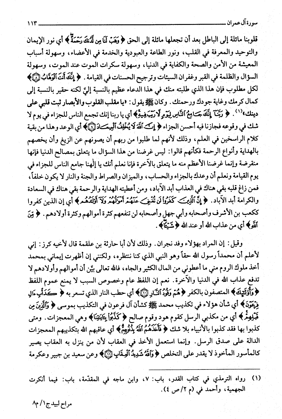 «1» . رَبَّنا إِنَّكَ جامِعُ النَّاسِ لِيَوْمٍ لا رَيْبَ فِيهِ أي يا ربنا إنك تجمع الناس للجزاء في يوم لا شك في وقوعه فجازنا فيه أحسن الجزاء إِنَّ اللَّهَ لا يُخْلِفُ الْمِيعادَ (9) أي الوعد وهذا من بقية كلام الراسخين في العلم، وذلك لأنهم لما طلبوا من ربهم أن يصونهم عن الزيغ وأن يخصهم بالهداية وأنواع الرحمة فكأنهم قالوا: ليس غرضنا من هذا السؤال ما يتعلق بمصالح الدنيا فإنها منقرضة وإنما غرضنا الأعظم منه ما يتعلق بالآخرة فإنا نعلم أنك يا إلهنا جامع الناس للجزاء في يوم القيامة ونعلم أن وعدك بالجزاء والحساب، والميزان والصراط والجنة والنار لا يكون خلفا، فمن زاغ قلبه بقي هناك في العذاب أبد الآباد، ومن أعطيته الهداية والرحمة بقي هناك في السعادة والكرامة أبد الآباد. إِنَّ الَّذِينَ كَفَرُوا لَنْ تُغْنِيَ عَنْهُمْ أَمْوالُهُمْ وَلا أَوْلادُهُمْ أي إن الذين كفروا ككعب بن الأشرف وأصحابه وأبي جهل وأصحابه لن تنفعهم كثرة أموالهم وكثرة أولادهم. مِنَ اللَّهِ أي من عذاب الله أو عند الله شَيْئاً.