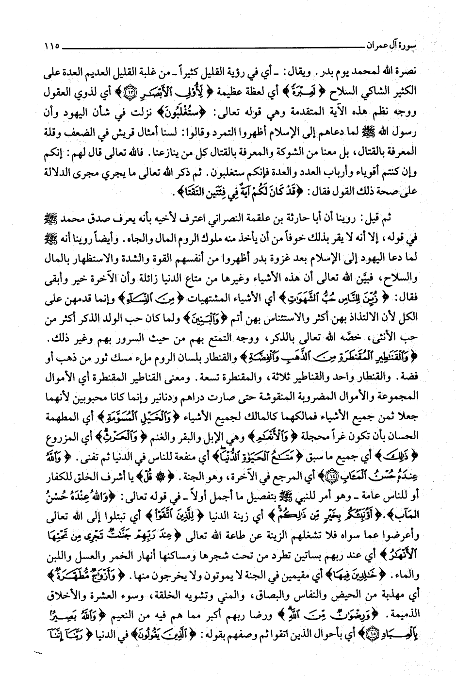 وَالْقَناطِيرِ الْمُقَنْطَرَةِ مِنَ الذَّهَبِ وَالْفِضَّةِ والقنطار بلسان الروم ملء مسك ثور من ذهب أو فضة. والقنطار واحد والقناطير ثلاثة، والمقنطرة تسعة. ومعنى القناطير المقنطرة أي الأموال المجموعة والأموال المضروبة المنقوشة حتى صارت دراهم ودنانير وإنما كانا محبوبين لأنهما جعلا ثمن جميع الأشياء فمالكهما كالمالك لجميع الأشياء وَالْخَيْلِ الْمُسَوَّمَةِ أي المطهمة الحسان بأن تكون غرا محجلة وَالْأَنْعامِ وهي الإبل والبقر والغنم وَالْحَرْثِ أي المزروع ذلِكَ أي جميع ما سبق مَتاعُ الْحَياةِ الدُّنْيا أي منفعة للناس في الدنيا ثم تفنى. وَاللَّهُ عِنْدَهُ حُسْنُ الْمَآبِ (14) أي المرجع في الآخرة، وهو الجنة. قُلْ يا أشرف الخلق للكفار أو للناس عامة- وهو أمر للنبي صلّى الله عليه وسلّم بتفصيل ما أجمل أولا- في قوله تعالى: وَاللَّهُ عِنْدَهُ حُسْنُ الْمَآبِ. أَأُنَبِّئُكُمْ بِخَيْرٍ مِنْ ذلِكُمْ أي زينة الدنيا لِلَّذِينَ اتَّقَوْا أي تبتلوا إلى الله تعالى وأعرضوا عما سواه فلا تشغلهم الزينة عن طاعة الله تعالى عِنْدَ رَبِّهِمْ جَنَّاتٌ تَجْرِي مِنْ تَحْتِهَا الْأَنْهارُ أي عند ربهم بساتين تطرد من تحت شجرها ومساكنها أنهار الخمر والعسل واللبن والماء. خالِدِينَ فِيها أي مقيمين في الجنة لا يموتون ولا يخرجون منها. وَأَزْواجٌ مُطَهَّرَةٌ أي مهذبة من الحيض والنفاس والبصاق، والمني وتشويه الخلقة، وسوء العشرة والأخلاق الذميمة. وَرِضْوانٌ مِنَ اللَّهِ ورضا ربهم أكبر مما هم فيه من النعيم وَاللَّهُ بَصِيرٌ بِالْعِبادِ (15) أي بأحوال الذين اتقوا ثم وصفهم بقوله: الَّذِينَ يَقُولُونَ في الدنيا رَبَّنا إِنَّنا