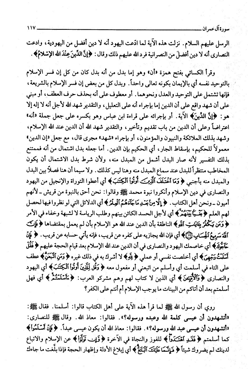 وقرأ الكسائي بفتح همزة «أن» وهو إما بدل من أنه بدل كان من كل إن فسر الإسلام بالتوحيد نفسه أي بالإيمان بكونه تعالى واحدا. وبدل كل من بعض إن فسر الإسلام بالشريعة، فإنها تشتمل على التوحيد والعدل ونحوهما. أو معطوف على أنه بحذف حرف العطف، أو مبني على أن شهد واقع على أن الدين إما بإجراء أنه على التعليل، والتقدير شهد الله لأجل أنه لا إله إلا هو: إِنَّ الدِّينَ الآية. أو بإجرائه على قراءة ابن عباس وهو بكسره على جعل جملة «أنه» اعتراضا وعلى أن الدين من باب تقديم وتأخير، والتقدير شهد الله أن الدين عند الله الإسلام، وشهد بذلك الملائكة والنبيون والمؤمنون، أو بإجراء «شهد» مجرى قال، مع جعل «إن الدين» معمولا للحكيم، بإسقاط الجار، أي الحكيم بإن الدين. أما جعله بدل اشتمال من أنه فممتنع بذلك التفسير لأنه صار البدل أشمل من المبدل منه، ولأن شرط بدل الاشتمال أن يكون المخاطب منتظرا للبدل عند سماع المبدل منه وهنا ليس كذلك. ولا سيما أن هنا فصلا بين البدل والمبدل منه بأجنبي وَمَا اخْتَلَفَ الَّذِينَ أُوتُوا الْكِتابَ أي أعطوا التوراة والإنجيل من اليهود والنصارى في دين الإسلام وأنكروا نبوة محمد صلّى الله عليه وسلّم وقالوا: نحن أحق بالنبوة من قريش- لأنهم أميون- ونحن أهل الكتاب. إِلَّا مِنْ بَعْدِ ما جاءَهُمُ الْعِلْمُ أي الدلائل التي لو نظروا فيها لحصل لهم العلم بَغْياً بَيْنَهُمْ أي لأجل الحسد الكائن بينهم وطلب الرياسة لا لشبهة وخفاء في الأمر وَمَنْ يَكْفُرْ بِآياتِ اللَّهِ الناطقة بأن الدين عند الله هو الإسلام بأن لم يعمل بمقتضاها فَإِنَّ اللَّهَ سَرِيعُ الْحِسابِ (19) أي فإن الله يجازيه على كفره عن قريب، فإنه يأتي حسابه عن قريب. فَإِنْ حَاجُّوكَ أي خاصمك اليهود والنصارى في أن الدين عند الله الإسلام بعد قيام الحجة عليهم فَقُلْ أَسْلَمْتُ وَجْهِيَ أي أخلصت نفسي أو عملي لِلَّهِ لا أشرك به في ذلك غيره وَمَنِ اتَّبَعَنِ عطف على التاء في أسلمت أي وأسلم من اتبعني أو مفعول معه وَقُلْ لِلَّذِينَ أُوتُوا الْكِتابَ أي اليهود والنصارى وَالْأُمِّيِّينَ أي الذين لا كتاب لهم وهم مشركو العرب: أَأَسْلَمْتُمْ أي فهل أسلمتم بعد أن أتاكم من البينات ما يوجب الإسلام أم أنتم على الكفر؟
