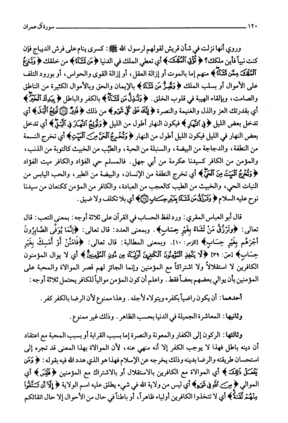 قال أبو العباس المقري: ورد لفظ الحساب في القرآن على ثلاثة أوجه: بمعنى التعب: قال تعالى: وَتَرْزُقُ مَنْ تَشاءُ بِغَيْرِ حِسابٍ. وبمعنى العدد: قال تعالى: إِنَّما يُوَفَّى الصَّابِرُونَ أَجْرَهُمْ بِغَيْرِ حِسابٍ [الزمر: 10] . وبمعنى المطالبة: قال تعالى: فَامْنُنْ أَوْ أَمْسِكْ بِغَيْرِ حِسابٍ [ص: 39] لا يَتَّخِذِ الْمُؤْمِنُونَ الْكافِرِينَ أَوْلِياءَ مِنْ دُونِ الْمُؤْمِنِينَ أي لا يوال المؤمنون الكافرين لا استقلالا ولا اشتراكا مع المؤمنين وإنما الجائز لهم قصر الموالاة والمحبة على المؤمنين بأن يوالي بعضهم بعضا فقط. واعلم أن كون المؤمن