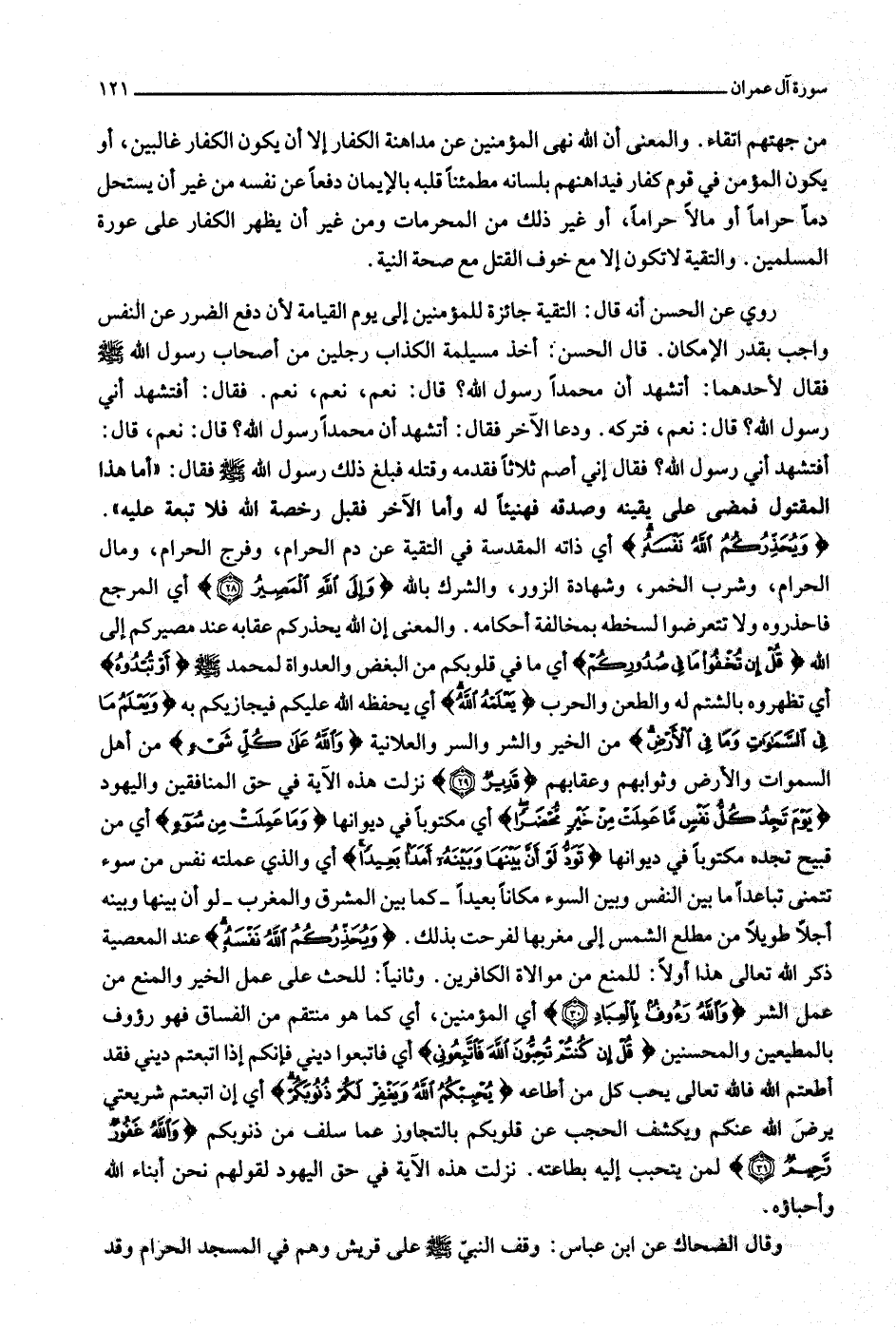 . وَيُحَذِّرُكُمُ اللَّهُ نَفْسَهُ أي ذاته المقدسة في التقية عن دم الحرام، وفرج الحرام، ومال الحرام، وشرب الخمر، وشهادة الزور، والشرك بالله وَإِلَى اللَّهِ الْمَصِيرُ (28) أي المرجع فاحذروه ولا تتعرضوا لسخطه بمخالفة أحكامه. والمعنى إن الله يحذركم عقابه عند مصيركم إلى الله قُلْ إِنْ تُخْفُوا ما فِي صُدُورِكُمْ أي ما في قلوبكم من البغض والعداوة لمحمد صلّى الله عليه وسلّم أَوْ تُبْدُوهُ أي تظهروه بالشتم له والطعن والحرب يَعْلَمْهُ اللَّهُ أي يحفظه الله عليكم فيجازيكم به وَيَعْلَمُ ما فِي السَّماواتِ وَما فِي الْأَرْضِ من الخير والشر والسر والعلانية وَاللَّهُ عَلى كُلِّ شَيْءٍ من أهل السموات والأرض وثوابهم وعقابهم قَدِيرٌ (29) نزلت هذه الآية في حق المنافقين واليهود يَوْمَ تَجِدُ كُلُّ نَفْسٍ ما عَمِلَتْ مِنْ خَيْرٍ مُحْضَراً أي مكتوبا في ديوانها وَما عَمِلَتْ مِنْ سُوءٍ أي من قبيح تجده مكتوبا في ديوانها تَوَدُّ لَوْ أَنَّ بَيْنَها وَبَيْنَهُ أَمَداً بَعِيداً أي والذي عملته نفس من سوء تتمنى تباعدا ما بين النفس وبين السوء مكانا بعيدا- كما بين المشرق والمغرب- لو أن بينها وبينه أجلا طويلا من مطلع الشمس إلى مغربها لفرحت بذلك. وَيُحَذِّرُكُمُ اللَّهُ نَفْسَهُ عند المعصية ذكر الله تعالى هذا أولا: للمنع من موالاة الكافرين. وثانيا: للحث على عمل الخير والمنع من عمل الشر وَاللَّهُ رَؤُفٌ بِالْعِبادِ (30) أي المؤمنين، أي كما هو منتقم من الفساق فهو رؤوف بالمطيعين والمحسنين