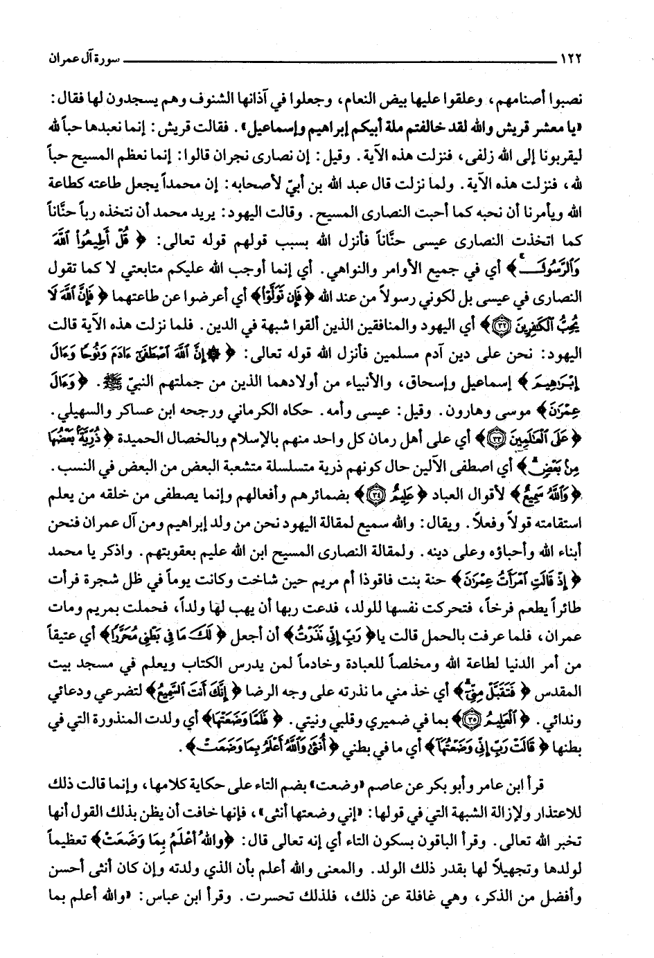 وَاللَّهُ سَمِيعٌ لأقوال العباد عَلِيمٌ (34) بضمائرهم وأفعالهم وإنما يصطفى من خلقه من يعلم استقامته قولا وفعلا. ويقال: والله سميع لمقالة اليهود نحن من ولد إبراهيم ومن آل عمران فنحن أبناء الله وأحباؤه وعلى دينه. ولمقالة النصارى المسيح ابن الله عليم بعقوبتهم. واذكر يا محمد إِذْ قالَتِ امْرَأَتُ عِمْرانَ حنة بنت فاقوذا أم مريم حين شاخت وكانت يوما في ظل شجرة فرأت طائرا يطعم فرخا، فتحركت نفسها للولد، فدعت ربها أن يهب لها ولدا، فحملت بمريم ومات عمران، فلما عرفت بالحمل قالت يا رَبِّ إِنِّي نَذَرْتُ أن أجعل لَكَ ما فِي بَطْنِي مُحَرَّراً أي عتيقا من أمر الدنيا لطاعة الله ومخلصا للعبادة وخادما لمن يدرس الكتاب ويعلم في مسجد بيت المقدس فَتَقَبَّلْ مِنِّي أي خذ مني ما نذرته على وجه الرضا إِنَّكَ أَنْتَ السَّمِيعُ لتضرعي ودعائي وندائي. الْعَلِيمُ (35) بما في ضميري وقلبي ونيتي. فَلَمَّا وَضَعَتْها أي ولدت المنذورة التي في بطنها قالَتْ رَبِّ إِنِّي وَضَعْتُها أي ما في بطني أُنْثى وَاللَّهُ أَعْلَمُ بِما وَضَعَتْ.