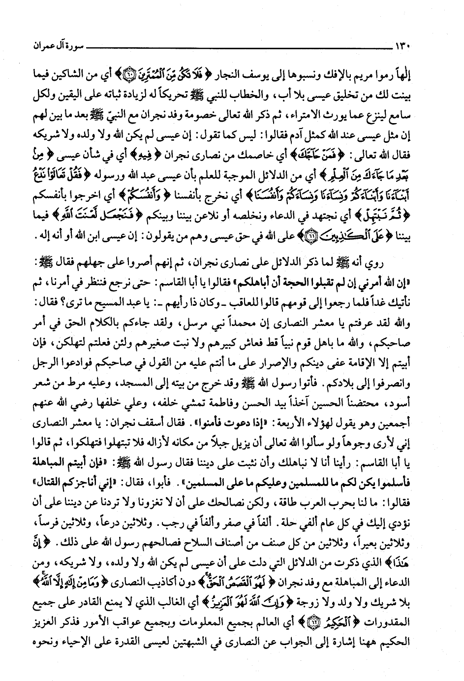 والله لقد عرفتم يا معشر النصارى إن محمدا نبي مرسل، ولقد جاءكم بالكلام الحق في أمر صاحبكم، والله ما باهل قوم نبيا قط فعاش كبيرهم ولا نبت صغيرهم ولئن فعلتم لتهلكن، فإن أبيتم إلا الإقامة عفى دينكم والإصرار على ما أنتم عليه من القول في صاحبكم فوادعوا الرجل وانصرفوا إلى بلادكم. فأتوا رسول الله صلّى الله عليه وسلّم وقد خرج من بيته إلى المسجد، وعليه مرط من شعر أسود، محتضنا الحسين آخذا بيد الحسن وفاطمة تمشي خلفه، وعلي خلفها رضي الله عنهم أجمعين وهو يقول لهؤلاء الأربعة: «إذا دعوت فأمنوا» . فقال أسقف نجران: يا معشر النصارى إني لأرى وجوها ولو سألوا الله تعالى أن يزيل جبلا من مكانه لأزاله فلا تبتهلوا فتهلكوا، ثم قالوا يا أبا القاسم: رأينا أنا لا نباهلك وأن نثبت على ديننا فقال رسول الله صلّى الله عليه وسلّم: «فإن أبيتم المباهلة فأسلموا يكن لكم ما للمسلمين وعليكم ما على المسلمين» . فأبوا، فقال: «إني أناجزكم القتال» فقالوا: ما لنا بحرب العرب طاقة، ولكن نصالحك على أن لا تغزونا ولا تردنا عن ديننا على أن نؤدي إليك في كل عام ألفي حلة. ألفا في صفر وألفا في رجب. وثلاثين درعا، وثلاثين فرسا، وثلاثين بعيرا، وثلاثين من كل صنف من أصناف السلاح فصالحهم رسول الله على ذلك