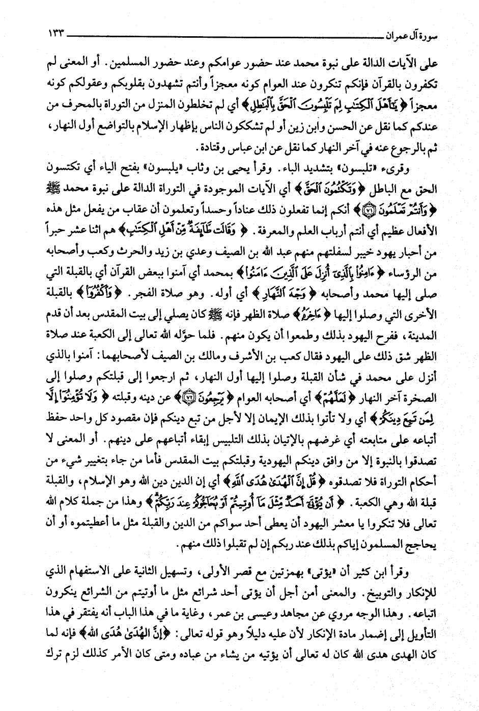 وقرئ «تلبسون» بتشديد الباء. وقرأ يحيى بن وثاب «يلبسون» بفتح الياء أي تكتسون الحق مع الباطل وَتَكْتُمُونَ الْحَقَّ أي الآيات الموجودة في التوراة الدالة على نبوة محمد صلّى الله عليه وسلّم وَأَنْتُمْ تَعْلَمُونَ (71) أنكم إنما تفعلون ذلك عنادا وحسدا وتعلمون أن عقاب من يفعل مثل هذه الأفعال عظيم أي أنتم أرباب العلم والمعرفة. وَقالَتْ طائِفَةٌ مِنْ أَهْلِ الْكِتابِ هم اثنا عشر حبرا من أحبار يهود خيبر لسفلتهم منهم عبد الله بن الصيف وعدي بن زيد والحرث وكعب وأصحابه من الرؤساء آمِنُوا بِالَّذِي أُنْزِلَ عَلَى الَّذِينَ آمَنُوا بمحمد أي آمنوا ببعض القرآن أي بالقبلة التي صلى إليها محمد وأصحابه وَجْهَ النَّهارِ أي أوله. وهو صلاة الفجر. وَاكْفُرُوا بالقبلة الأخرى التي وصلوا إليها آخِرَهُ صلاة الظهر فإنه صلّى الله عليه وسلّم كان يصلي إلى بيت المقدس بعد أن قدم المدينة، ففرح اليهود بذلك وطمعوا أن يكون منهم. فلما حوّله الله تعالى إلى الكعبة عند صلاة الظهر شق ذلك على اليهود فقال كعب بن الأشرف ومالك بن الصيف لأصحابهما: آمنوا بالذي أنزل على محمد في شأن القبلة وصلوا إليها أول النهار، ثم ارجعوا إلى قبلتكم وصلوا إلى الصخرة آخر النهار لَعَلَّهُمْ أي أصحابه العوام يَرْجِعُونَ (72) عن دينه وقبلته وَلا تُؤْمِنُوا إِلَّا لِمَنْ تَبِعَ دِينَكُمْ أي ولا تأتوا بذلك الإيمان إلا لأجل من تبع دينكم فإن مقصود كل واحد حفظ أتباعه على متابعته أي غرضهم بالإتيان بذلك التلبيس إبقاء أتباعهم على دينهم. أو المعنى لا تصدقوا بالنبوة إلا من وافق دينكم اليهودية وقبلتكم بيت المقدس فأما من جاء بتغيير شيء من أحكام التوراة فلا تصدقوه قُلْ إِنَّ الْهُدى هُدَى اللَّهِ أي إن الدين دين الله وهو الإسلام، والقبلة قبلة الله وهي الكعبة. أَنْ يُؤْتى أَحَدٌ مِثْلَ ما أُوتِيتُمْ أَوْ يُحاجُّوكُمْ عِنْدَ رَبِّكُمْ وهذا من جملة كلام الله تعالى فلا تنكروا يا معشر اليهود أن يعطى أحد سواكم من الدين والقبلة مثل ما أعطيتموه أو أن يحاجج المسلمون إياكم بذلك عند ربكم إن لم تقبلوا ذلك منهم.
