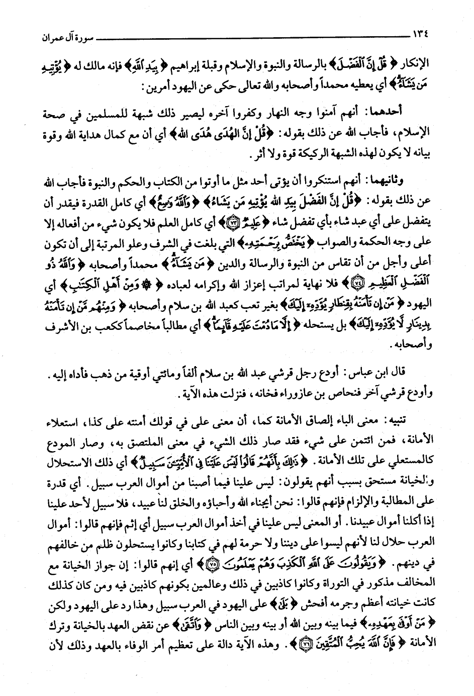وثانيهما: أنهم استنكروا أن يؤتى أحد مثل ما أوتوا من الكتاب والحكم والنبوة فأجاب الله عن ذلك بقوله: قُلْ إِنَّ الْفَضْلَ بِيَدِ اللَّهِ يُؤْتِيهِ مَنْ يَشاءُ وَاللَّهُ واسِعٌ أي كامل القدرة فيقدر أن يتفضل على أي عبد شاء بأي تفضل شاء عَلِيمٌ (73) أي كامل العلم فلا يكون شيء من أفعاله إلا على وجه الحكمة والصواب يَخْتَصُّ بِرَحْمَتِهِ التي بلغت في الشرف وعلو المرتبة إلى أن تكون أعلى وأجل من أن تقاس من النبوة والرسالة والدين مَنْ يَشاءُ محمدا وأصحابه وَاللَّهُ ذُو الْفَضْلِ الْعَظِيمِ (74) فلا نهاية لمراتب إعزاز الله وإكرامه لعباده وَمِنْ أَهْلِ الْكِتابِ أي اليهود مَنْ إِنْ تَأْمَنْهُ بِقِنْطارٍ يُؤَدِّهِ إِلَيْكَ بغير تعب كعبد الله بن سلام وأصحابه وَمِنْهُمْ مَنْ إِنْ تَأْمَنْهُ بِدِينارٍ لا يُؤَدِّهِ إِلَيْكَ بل يستحله إِلَّا ما دُمْتَ عَلَيْهِ قائِماً أي مطالبا مخاصما ككعب بن الأشرف وأصحابه.