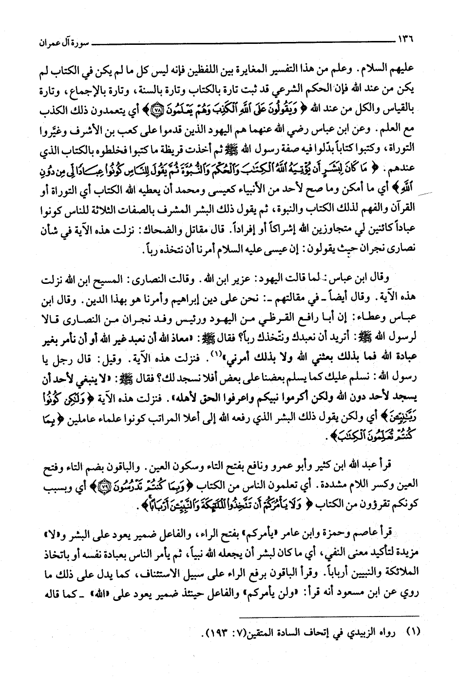 قرأ عبد الله ابن كثير وأبو عمرو ونافع بفتح التاء وسكون العين. والباقون بضم التاء وفتح العين وكسر اللام مشددة. أي تعلمون الناس من الكتاب وَبِما كُنْتُمْ تَدْرُسُونَ (79) أي وبسبب كونكم تقرؤون من الكتاب وَلا يَأْمُرَكُمْ أَنْ تَتَّخِذُوا الْمَلائِكَةَ وَالنَّبِيِّينَ أَرْباباً.