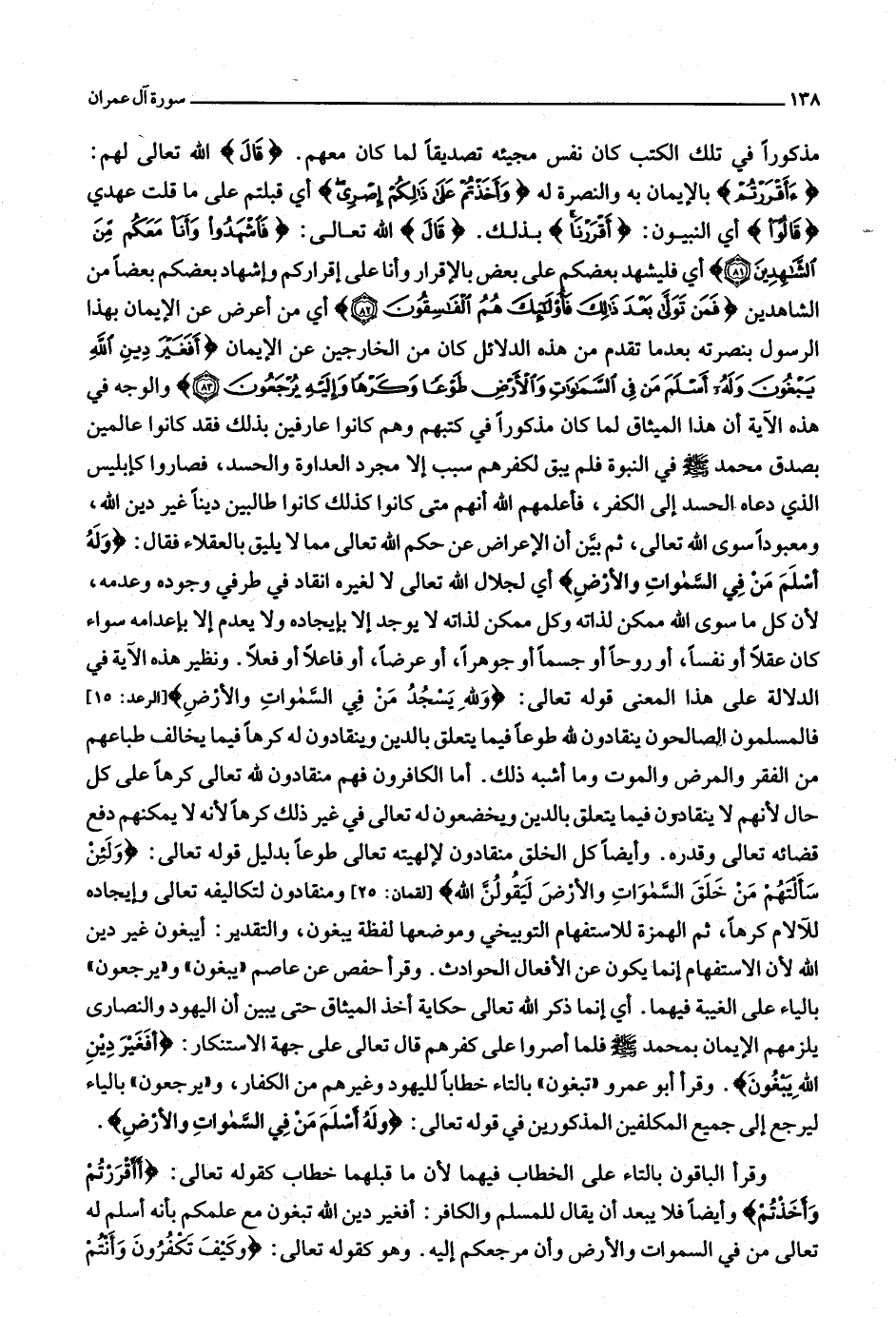 أَأَقْرَرْتُمْ بالإيمان به والنصرة له وَأَخَذْتُمْ عَلى ذلِكُمْ إِصْرِي أي قبلتم على ما قلت عهدي قالُوا أي النبيون: أَقْرَرْنا بذلك. قالَ الله تعالى: فَاشْهَدُوا وَأَنَا مَعَكُمْ مِنَ الشَّاهِدِينَ (81) أي فليشهد بعضكم على بعض بالإقرار وأنا على إقراركم وإشهاد بعضكم بعضا من الشاهدين فَمَنْ تَوَلَّى بَعْدَ ذلِكَ فَأُولئِكَ هُمُ الْفاسِقُونَ (82) أي من أعرض عن الإيمان بهذا الرسول بنصرته بعد ما تقدم من هذه الدلائل كان من الخارجين عن الإيمان أَفَغَيْرَ دِينِ اللَّهِ يَبْغُونَ وَلَهُ أَسْلَمَ مَنْ فِي السَّماواتِ وَالْأَرْضِ طَوْعاً وَكَرْهاً وَإِلَيْهِ يُرْجَعُونَ (83) والوجه في هذه الآية أن هذا الميثاق لما كان مذكورا في كتبهم وهم كانوا عارفين بذلك فقد كانوا عالمين بصدق محمد صلّى الله عليه وسلّم في النبوة فلم يبق لكفرهم سبب إلا مجرد العداوة والحسد، فصاروا كإبليس الذي دعاه الحسد إلى الكفر، فأعلمهم الله أنهم متى كانوا كذلك كانوا طالبين دينا غير دين الله، ومعبودا سوى الله تعالى، ثم بيّن أن الإعراض عن حكم الله تعالى مما لا يليق بالعقلاء فقال: وَلَهُ أَسْلَمَ مَنْ فِي السَّماواتِ وَالْأَرْضِ أي لجلال الله تعالى لا لغيره انقاد في طرفي وجوده وعدمه، لأن كل ما سوى الله ممكن لذاته وكل ممكن لذاته لا يوجد إلا بإيجاده ولا يعدم إلا بإعدامه سواء كان عقلا أو نفسا، أو روحا أو جسما أو جوهرا، أو عرضا، أو فاعلا أو فعلا. ونظير هذه الآية في الدلالة على هذا المعنى قوله تعالى: وَلِلَّهِ يَسْجُدُ مَنْ فِي السَّماواتِ وَالْأَرْضِ [الرعد: 15] فالمسلمون الصالحون ينقادون لله طوعا فيما يتعلق بالدين وينقادون له كرها فيما يخالف طباعهم من الفقر والمرض والموت وما أشبه ذلك. أما الكافرون فهم منقادون لله تعالى كرها على كل حال لأنهم لا ينقادون فيما يتعلق بالدين ويخضعون له تعالى في غير ذلك كرها لأنه لا يمكنهم دفع قضائه تعالى وقدره. وأيضا كل الخلق منقادون لإلهيته تعالى طوعا بدليل قوله تعالى: وَلَئِنْ سَأَلْتَهُمْ مَنْ خَلَقَ السَّماواتِ وَالْأَرْضَ لَيَقُولُنَّ اللَّهُ [لقمان: 25] ومنقادون لتكاليفه تعالى وإيجاده للآلام كرها، ثم الهمزة للاستفهام التوبيخي وموضعها لفظة يبغون، والتقدير: أيبغون غير دين الله لأن الاستفهام إنما يكون عن الأفعال الحوادث. وقرأ حفص عن عاصم «يبغون» و «يرجعون» بالياء على الغيبة فيهما. أي إنما ذكر الله تعالى حكاية أخذ الميثاق حتى يبين أن اليهود والنصارى يلزمهم الإيمان بمحمد صلّى الله عليه وسلّم فلما أصروا على كفرهم قال تعالى على جهة الاستنكار: أَفَغَيْرَ دِينِ اللَّهِ يَبْغُونَ. وقرأ أبو عمرو «تبغون» بالتاء خطابا لليهود وغيرهم من الكفار، و «يرجعون» بالياء ليرجع إلى جميع المكلفين المذكورين في قوله تعالى: وَلَهُ أَسْلَمَ مَنْ فِي السَّماواتِ وَالْأَرْضِ.