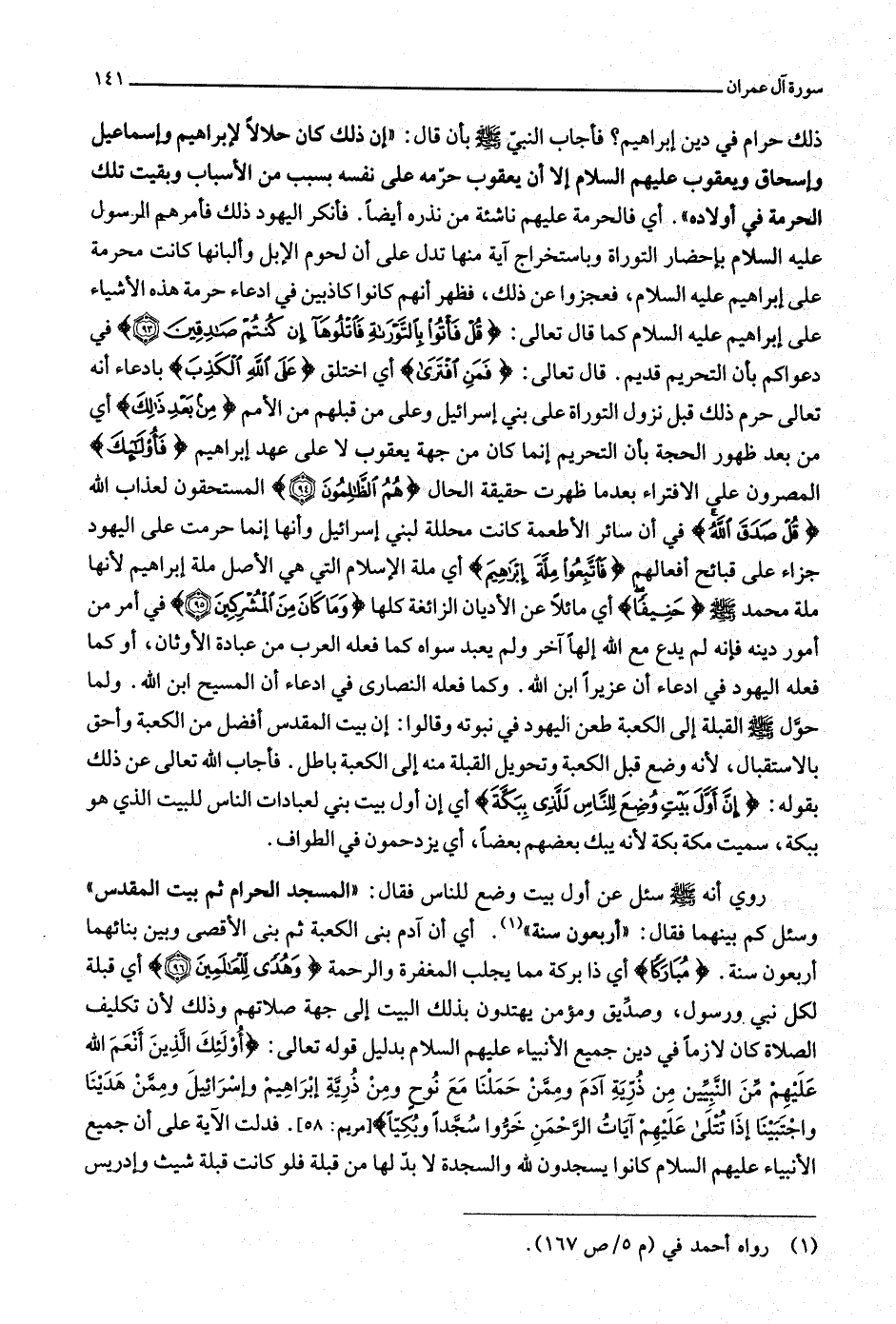 «1» . أي أن آدم بنى الكعبة ثم بنى الأقصى وبين بنائهما أربعون سنة. مُبارَكاً أي ذا بركة مما يجلب المغفرة والرحمة وَهُدىً لِلْعالَمِينَ (96) أي قبلة لكل نبي ورسول، وصدّيق ومؤمن يهتدون بذلك البيت إلى جهة صلاتهم وذلك لأن تكليف الصلاة كان لازما في دين جميع الأنبياء عليهم السلام بدليل قوله تعالى: أُولئِكَ الَّذِينَ أَنْعَمَ اللَّهُ عَلَيْهِمْ مِنَ النَّبِيِّينَ مِنْ ذُرِّيَّةِ آدَمَ وَمِمَّنْ حَمَلْنا مَعَ نُوحٍ وَمِنْ ذُرِّيَّةِ إِبْراهِيمَ وَإِسْرائِيلَ وَمِمَّنْ هَدَيْنا وَاجْتَبَيْنا إِذا تُتْلى عَلَيْهِمْ آياتُ الرَّحْمنِ خَرُّوا سُجَّداً وَبُكِيًّا [مريم: 58] . فدلت الآية على أن جميع الأنبياء عليهم السلام كانوا يسجدون لله والسجدة لا بدّ لها من قبلة فلو كانت قبلة شيث وإدريس