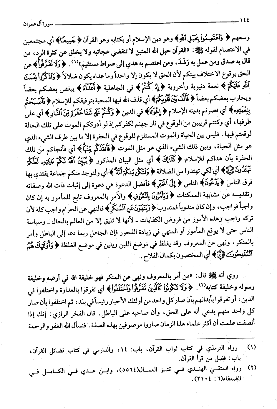 «1» . وَلا تَفَرَّقُوا عن الحق بوقوع الاختلاف بينكم لأن الحق لا يكون إلا واحدا وما عداه يكون ضلالا وَاذْكُرُوا نِعْمَتَ اللَّهِ عَلَيْكُمْ نعمة دنيوية وأخروية إِذْ كُنْتُمْ في الجاهلية أَعْداءً يبغض بعضكم بعضا ويحارب بعضكم بعضا فَأَلَّفَ بَيْنَ قُلُوبِكُمْ أي قذف الله فيها المحبة بتوفيقكم للإسلام فَأَصْبَحْتُمْ بِنِعْمَتِهِ أي فصرتم بدينه الإسلام إِخْواناً في الدين وَكُنْتُمْ عَلى شَفا حُفْرَةٍ مِنَ النَّارِ أي على طرفها، أي وكنتم قريبين من الوقوع في نار جهنم لكفركم إذ لو أدرككم الموت على تلك الحالة لوقعتم فيها. فليس بين الحياة والموت المستلزم للوقوع في الحفرة إلا ما بين طرف الشيء الذي هو مثل الحياة، وبين ذلك الشيء الذي هو مثل الموت فَأَنْقَذَكُمْ مِنْها أي فأنجاكم من تلك الحفرة بأن هداكم للإسلام كَذلِكَ أي مثل البيان المذكور يُبَيِّنُ اللَّهُ لَكُمْ آياتِهِ لَعَلَّكُمْ تَهْتَدُونَ (103) أي لكي تهتدوا من الضلالة وَلْتَكُنْ مِنْكُمْ أُمَّةٌ أي ولتوجد منكم جماعة يقتدي بها فرق الناس يَدْعُونَ الناس إِلَى الْخَيْرِ فأفضل الدعوة هي دعوة إلى إثبات ذات الله وصفاته وتقديسه عن مشابهة الممكنات وَيَأْمُرُونَ بِالْمَعْرُوفِ والآمر بالمعروف تابع للمأمور به إن كان واجبا فواجب، وإن كان مندوبا فمندوب وَيَنْهَوْنَ عَنِ الْمُنْكَرِ فالنهي عن الحرام واجب كله لأن تركه واجب وهذه الأمور من فروض الكفايات- لأنها لا تليق إلا من العالم بالحال- وسياسة الناس حتى لا يوقع المأمور أو المنهي في زيادة الفجور فإن الجاهل ربما دعا إلى الباطل وأمر بالمنكر، ونهى عن المعروف وقد يغلظ في موضع اللين ويلين في موضع الغلظة وَأُولئِكَ هُمُ الْمُفْلِحُونَ (104) أي المختصون بكمال الفلاح.
