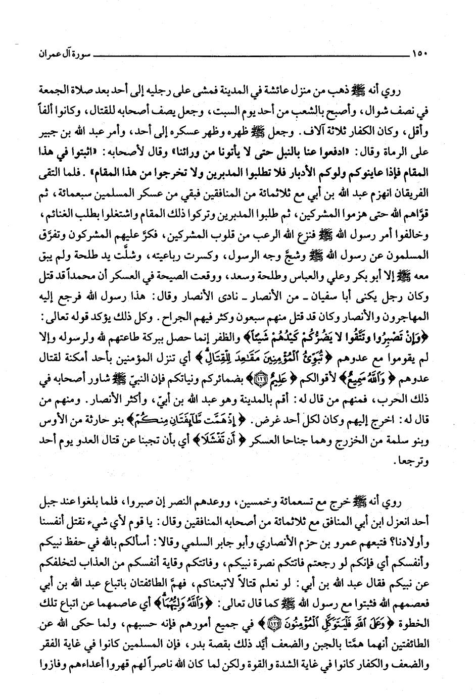 روي أنه صلّى الله عليه وسلّم خرج مع تسعمائة وخمسين، ووعدهم النصر إن صبروا، فلما بلغوا عند جبل أحد انعزل ابن أبي المنافق مع ثلاثمائة من أصحابه المنافقين وقال: يا قوم لأي شيء نقتل أنفسنا وأولادنا؟ فتبعهم عمرو بن حزم الأنصاري وأبو جابر السلمي وقالا: أسألكم بالله في حفظ نبيكم وأنفسكم أي فإنكم لو رجعتم فاتتكم نصرة نبيكم، وفاتتكم وقاية أنفسكم من العذاب لتخلفكم عن نبيكم فقال عبد الله بن أبي: لو نعلم قتالا لاتبعناكم، فهمّ الطائفتان باتباع عبد الله بن أبي فعصمهم الله فثبتوا مع رسول الله صلّى الله عليه وسلّم كما قال تعالى: وَاللَّهُ وَلِيُّهُما أي عاصمهما عن اتباع تلك الخطوة وَعَلَى اللَّهِ فَلْيَتَوَكَّلِ الْمُؤْمِنُونَ (122) في جميع أمورهم فإنه حسبهم، ولما حكى الله عن الطائفتين أنهما همّتا بالجبن والضعف أيّد ذلك بقصة بدر، فإن المسلمين كانوا في غاية الفقر والضعف والكفار كانوا في غاية الشدة والقوة ولكن لما كان الله ناصرا لهم قهروا أعداءهم وفازوا