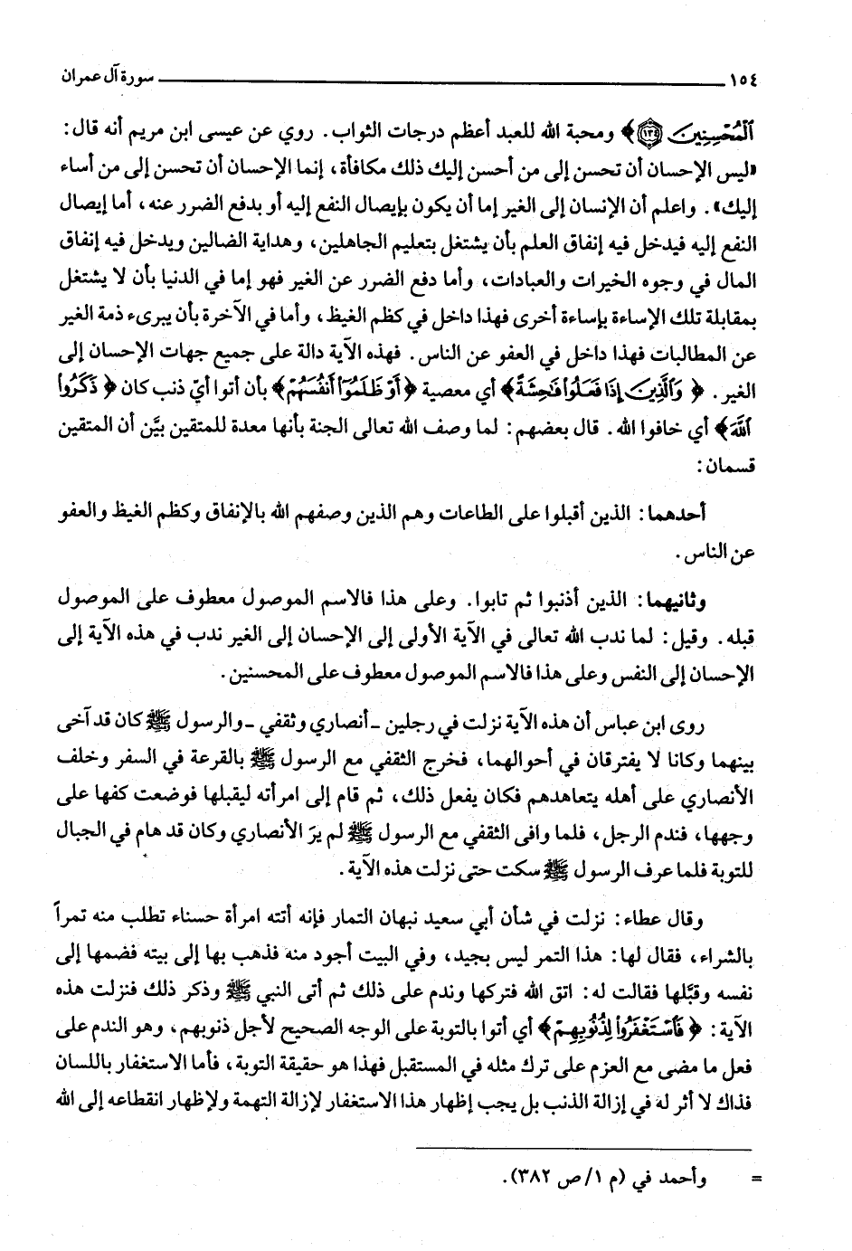 «ليس الإحسان أن تحسن إلى من أحسن إليك ذلك مكافأة، إنما الإحسان أن تحسن إلى من أساء إليك» . واعلم أن الإنسان إلى الغير إما أن يكون بإيصال النفع إليه أو بدفع الضرر عنه، أما إيصال النفع إليه فيدخل فيه إنفاق العلم بأن يشتغل بتعليم الجاهلين، وهداية الضالين ويدخل فيه إنفاق المال في وجوه الخيرات والعبادات، وأما دفع الضرر عن الغير فهو إما في الدنيا بأن لا يشتغل بمقابلة تلك الإساءة بإساءة أخرى فهذا داخل في كظم الغيظ، وأما في الآخرة بأن يبرئ ذمة الغير عن المطالبات فهذا داخل في العفو عن الناس. فهذه الآية دالة على جميع جهات الإحسان إلى الغير. وَالَّذِينَ إِذا فَعَلُوا فاحِشَةً أي معصية أَوْ ظَلَمُوا أَنْفُسَهُمْ بأن أتوا أيّ ذنب كان ذَكَرُوا اللَّهَ أي خافوا الله. قال بعضهم: لما وصف الله تعالى الجنة بأنها معدة للمتقين بيّن أن المتقين قسمان: