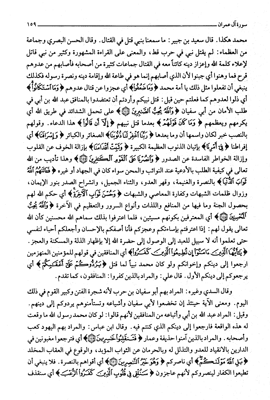 محمد هكذا. قال سعيد بن جبير: ما سمعنا بنبي قتل في القتال. وقال الحسن البصري وجماعة من العظماء: لم يقتل نبي في حرب قط، والمعنى على القراءة المشهورة وكثير من نبي قاتل لإعلاء كلمة الله وإعزاز دينه كائنا معه في القتال جماعات كثيرة من أصحابه فأصابهم من عدوهم قرح فما وهنوا أي جبنوا لأن الذي أصابهم إنما هو في طاعة الله وإقامة دينه ونصرة رسوله فكذلك ينبغي أن تفعلوا مثل ذلك يا أمة محمد وَما ضَعُفُوا أي عجزوا عن قتال عدوهم وَمَا اسْتَكانُوا أي ذلوا لعدوهم كما فعلتم حين قيل: قتل نبيكم وأردتم أن تعتضدوا بالمنافق عبد الله بن أبي في طلب الأمان من أبي سفيان وَاللَّهُ يُحِبُّ الصَّابِرِينَ (146) على تحمل الشدائد في طريق الله أي يكرمهم ويعظمهم وَما كانَ قَوْلَهُمْ بعد ما قتل نبيهم إِلَّا أَنْ قالُوا هذا الدعاء. وقولهم بالنصب خبر لكان واسمها أن وما بعدها رَبَّنَا اغْفِرْ لَنا ذُنُوبَنا الصغائر والكبائر وَإِسْرافَنا أي إفراطنا فِي أَمْرِنا بإتيان الذنوب العظيمة الكبيرة وَثَبِّتْ أَقْدامَنا بإزالة الخوف عن القلوب وإزالة الخواطر الفاسدة عن الصدور وَانْصُرْنا عَلَى الْقَوْمِ الْكافِرِينَ (147) وهذا تأديب من الله تعالى في كيفية الطلب بالأدعية عند النوائب والمحن سواء كان في الجهاد أو غيره فَآتاهُمُ اللَّهُ ثَوابَ الدُّنْيا بالنصرة والغنيمة، وقهر العدو، والثناء الجميل، وانشراح الصدر بنور الإيمان، وزوال ظلمات الشبهات وكفارة المعاصي والشبهات وَحُسْنَ ثَوابِ الْآخِرَةِ أي حكم الله لهم بحصول الجنة وما فيها من المنافع واللذات وأنواع السرور والتعظيم في الآخرة وَاللَّهُ يُحِبُّ الْمُحْسِنِينَ (148) أي المعترفين بكونهم مسيئين، فلما اعترفوا بذلك سماهم الله محسنين كأن الله تعالى يقول لهم: إذا اعترفتم بإساءتكم وعجزكم فأنا أصفكم بالإحسان وأجعلكم أحباء لنفسي حتى تعلموا أنه لا سبيل للعبد إلى الوصول إلى حضرة الله إلا بإظهار الذلة والمسكنة والعجز.