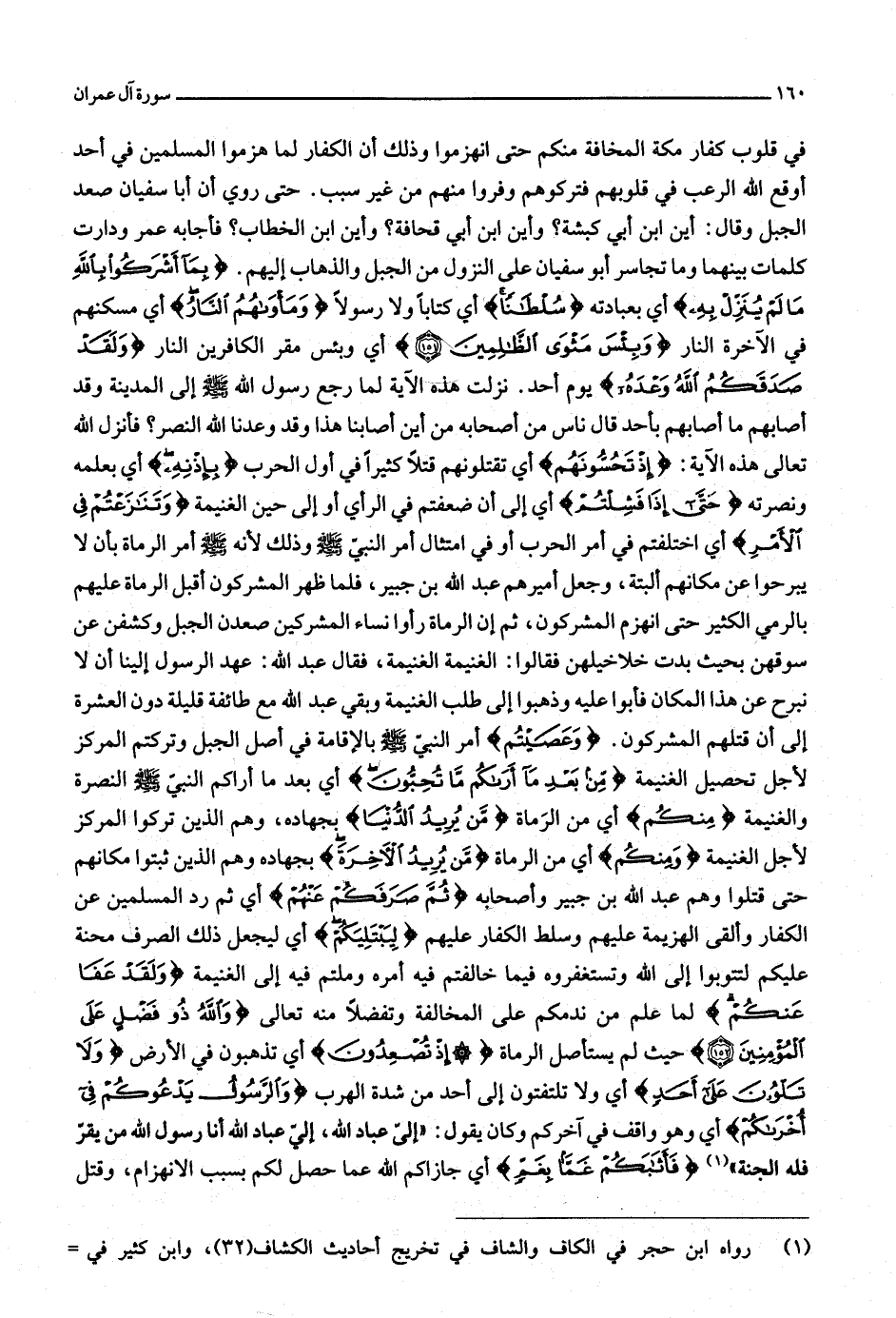 في قلوب كفار مكة المخافة منكم حتى انهزموا وذلك أن الكفار لما هزموا المسلمين في أحد أوقع الله الرعب في قلوبهم فتركوهم وفروا منهم من غير سبب. حتى روي أن أبا سفيان صعد الجبل وقال: أين ابن أبي كبشة؟ وأين ابن أبي قحافة؟ وأين ابن الخطاب؟ فأجابه عمر ودارت كلمات بينهما وما تجاسر أبو سفيان على النزول من الجبل والذهاب إليهم. بِما أَشْرَكُوا بِاللَّهِ ما لَمْ يُنَزِّلْ بِهِ أي بعبادته سُلْطاناً أي كتابا ولا رسولا وَمَأْواهُمُ النَّارُ أي مسكنهم في الآخرة النار وَبِئْسَ مَثْوَى الظَّالِمِينَ (151) أي وبئس مقر الكافرين النار وَلَقَدْ صَدَقَكُمُ اللَّهُ وَعْدَهُ يوم أحد. نزلت هذه الآية لما رجع رسول الله صلّى الله عليه وسلّم إلى المدينة وقد أصابهم ما أصابهم بأحد قال