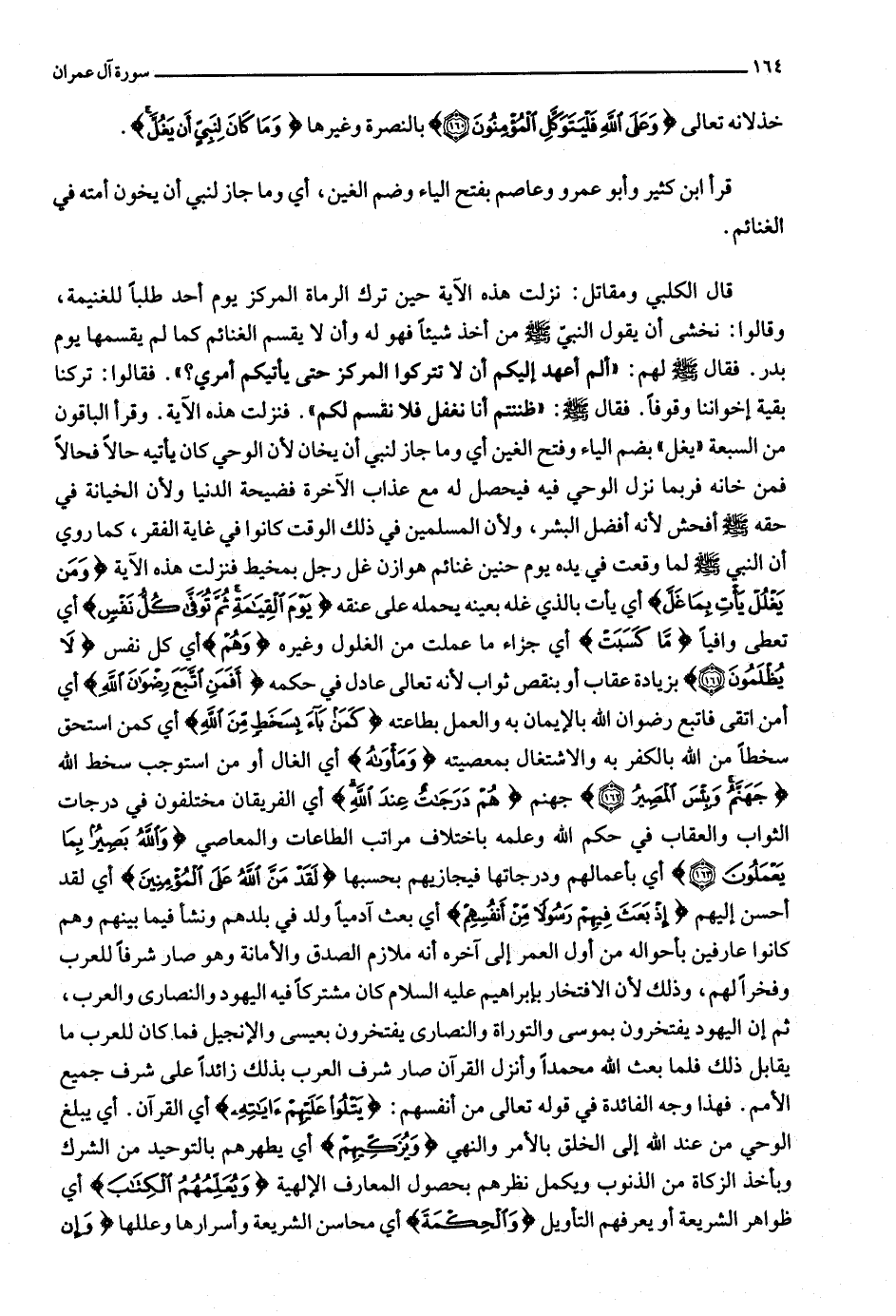 . وقرأ الباقون من السبعة «يغل» بضم الياء وفتح الغين أي وما جاز لنبي أن يخان لأن الوحي كان يأتيه حالا فحالا فمن خانه فربما نزل الوحي فيه فيحصل له مع عذاب الآخرة فضيحة الدنيا ولأن الخيانة في حقه صلّى الله عليه وسلّم أفحش لأنه أفضل البشر، ولأن المسلمين في ذلك الوقت كانوا في غاية الفقر، كما روي أن النبي صلّى الله عليه وسلّم لما وقعت في يده يوم حنين غنائم هوازن غل رجل بمخيط فنزلت هذه الآية وَمَنْ يَغْلُلْ يَأْتِ بِما غَلَّ أي يأت بالذي غله بعينه يحمله على عنقه يَوْمَ الْقِيامَةِ ثُمَّ تُوَفَّى كُلُّ نَفْسٍ أي تعطى وافيا ما كَسَبَتْ أي جزاء ما عملت من الغلول وغيره وَهُمْ أي كل نفس لا يُظْلَمُونَ (161) بزيادة عقاب أو بنقص ثواب لأنه تعالى عادل في حكمه أَفَمَنِ اتَّبَعَ رِضْوانَ اللَّهِ أي أمن اتقى فاتبع رضوان الله بالإيمان به والعمل بطاعته كَمَنْ باءَ بِسَخَطٍ مِنَ اللَّهِ أي كمن استحق سخطا من الله بالكفر به والاشتغال بمعصيته وَمَأْواهُ أي الغال أو من استوجب سخط الله جَهَنَّمُ وَبِئْسَ الْمَصِيرُ (162) جهنم هُمْ دَرَجاتٌ عِنْدَ اللَّهِ أي الفريقان مختلفون في درجات الثواب والعقاب في حكم الله وعلمه باختلاف مراتب الطاعات والمعاصي وَاللَّهُ بَصِيرٌ بِما يَعْمَلُونَ (163) أي بأعمالهم ودرجاتها فيجازيهم بحسبها لَقَدْ مَنَّ اللَّهُ عَلَى الْمُؤْمِنِينَ أي لقد أحسن إليهم إِذْ بَعَثَ فِيهِمْ رَسُولًا مِنْ أَنْفُسِهِمْ أي بعث آدميا ولد في بلدهم ونشأ فيما بينهم وهم كانوا عارفين بأحواله من أول العمر إلى آخره أنه ملازم الصدق والأمانة وهو صار شرفا للعرب وفخرا لهم، وذلك لأن الافتخار بإبراهيم عليه السلام كان مشتركا فيه اليهود والنصارى والعرب، ثم إن اليهود يفتخرون بموسى والتوراة والنصارى يفتخرون بعيسى والإنجيل فما كان للعرب ما يقابل ذلك فلما بعث الله محمدا وأنزل القرآن صار شرف العرب بذلك زائدا على شرف جميع الأمم. فهذا وجه الفائدة في قوله تعالى من أنفسهم: يَتْلُوا عَلَيْهِمْ آياتِهِ أي القرآن. أي يبلغ الوحي من عند الله إلى الخلق بالأمر والنهي وَيُزَكِّيهِمْ أي يطهرهم بالتوحيد من الشرك وبأخذ الزكاة من الذنوب ويكمل نظرهم بحصول المعارف الإلهية وَيُعَلِّمُهُمُ الْكِتابَ أي ظواهر الشريعة أو يعرفهم التأويل وَالْحِكْمَةَ أي محاسن الشريعة وأسرارها وعللها وَإِنْ