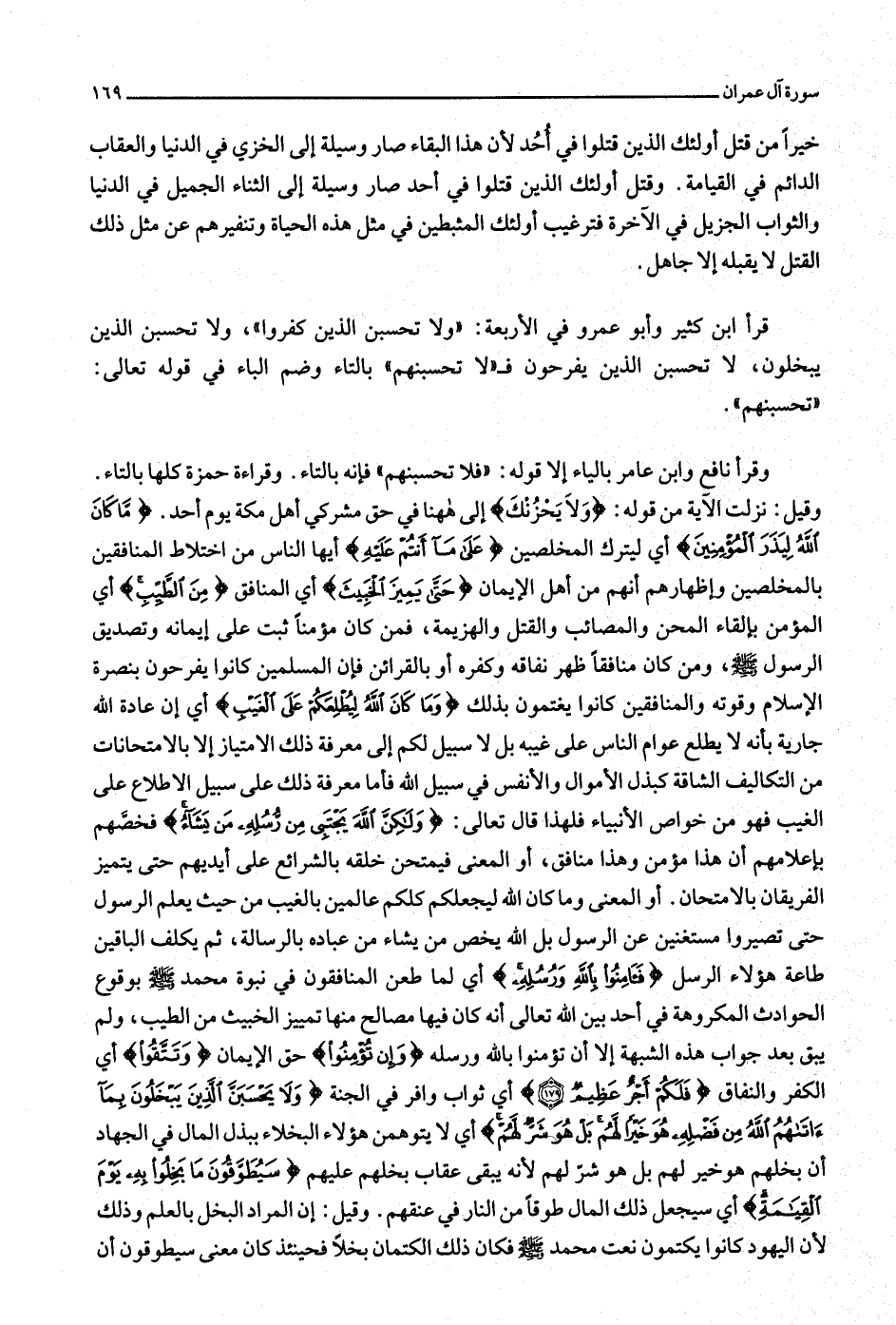 قرأ ابن كثير وأبو عمرو في الأربعة: «ولا تحسبن الذين كفروا» ، ولا تحسبن الذين يبخلون، لا تحسبن الذين يفرحون ف «لا تحسبنهم» بالتاء وضم الباء في قوله تعالى: