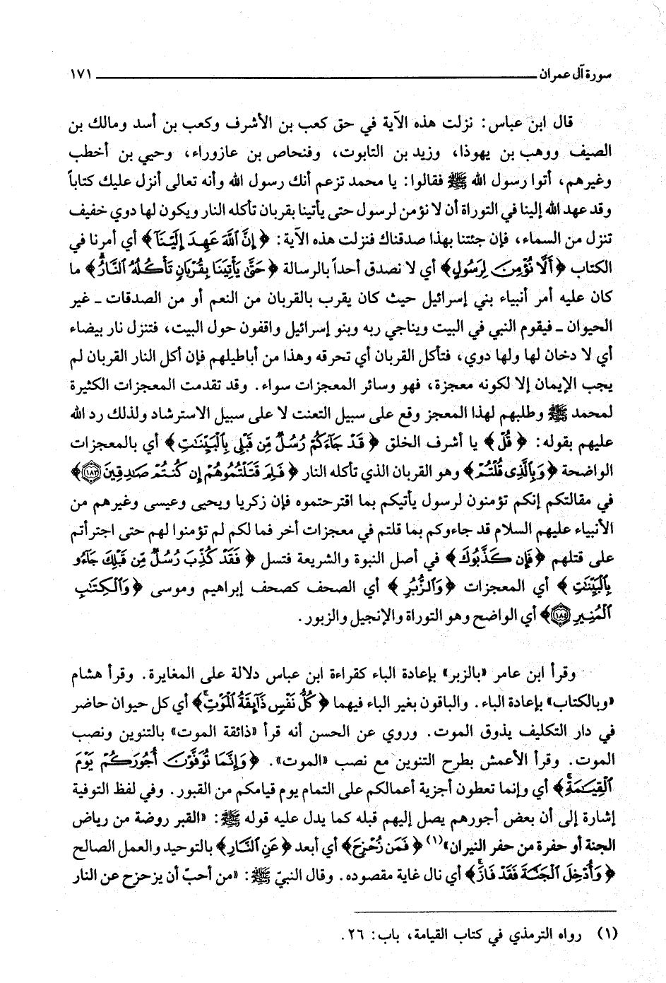 وقرأ ابن عامر «بالزبر» بإعادة الباء كقراءة ابن عباس دلالة على المغايرة. وقرأ هشام «وبالكتاب» بإعادة الباء. والباقون بغير الباء فيهما كُلُّ نَفْسٍ ذائِقَةُ الْمَوْتِ أي