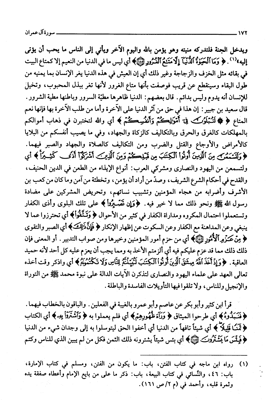 «1» . وَمَا الْحَياةُ الدُّنْيا إِلَّا مَتاعُ الْغُرُورِ (185) أي ليس ما في الدنيا من النعيم إلا كمتاع البيت في بقائه مثل الخزف والزجاجة وغير ذلك أي إن العيش في هذه الدنيا يغر الإنسان بما يمنيه من طول البقاء وسينقطع عن قريب فوصفت بأنها متاع الغرور لأنها تغر ببذل المحبوب، وتخيل للإنسان أنه يدوم وليس بدائم. قال بعضهم: الدنيا ظاهرها مطيّة السرور وباطنها مطية الشرور.