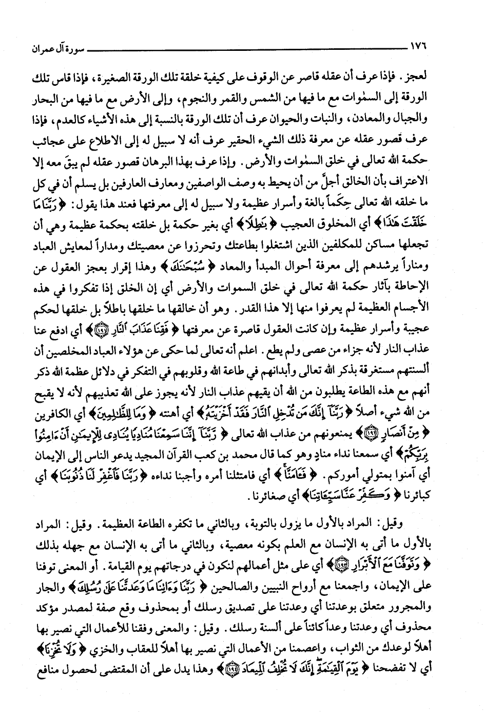 لعجز. فإذا عرف أن عقله قاصر عن الوقوف على كيفية خلقة تلك الورقة الصغيرة، فإذا قاس تلك الورقة إلى السموات مع ما فيها من الشمس والقمر والنجوم، وإلى الأرض مع ما فيها من البحار والجبال والمعادن، والنبات والحيوان عرف أن تلك الورقة بالنسبة إلى هذه الأشياء كالعدم، فإذا عرف قصور عقله عن معرفة ذلك الشيء الحقير عرف أنه لا سبيل له إلى الاطلاع على عجائب حكمة الله تعالى في خلق السموات والأرض. وإذا عرف بهذا البرهان قصور عقله لم يبق معه إلا الاعتراف بأن الخالق أجلّ من أن يحيط به وصف الواصفين ومعارف العارفين بل يسلم أن في كل ما خلقه الله تعالى حكما بالغة وأسرار عظيمة ولا سبيل له إلى معرفتها فعند هذا يقول: رَبَّنا ما خَلَقْتَ هذا أي المخلوق العجيب باطِلًا أي بغير حكمة بل خلقته بحكمة عظيمة وهي أن تجعلها مساكن للمكلفين الذين اشتغلوا بطاعتك وتحرزوا عن معصيتك ومدارا لمعايش العباد ومنارا يرشدهم إلى معرفة أحوال المبدأ والمعاد سُبْحانَكَ وهذا إقرار بعجز العقول عن الإحاطة بآثار حكمة الله تعالى في خلق السموات والأرض أي إن الخلق إذا تفكروا في هذه الأجسام العظيمة لم يعرفوا منها إلا هذا القدر. وهو أن خالقها ما خلقها باطلا بل خلقها لحكم عجيبة وأسرار عظيمة وإن كانت العقول قاصرة عن معرفتها فَقِنا عَذابَ النَّارِ (191) أي ادفع عنا عذاب النار لأنه جزاء من عصى ولم يطع. اعلم أنه تعالى لما حكى عن هؤلاء العباد المخلصين أن ألسنتهم مستغرقة بذكر الله تعالى وأبدانهم في طاعة الله وقلوبهم في التفكر في دلائل عظمة الله ذكر أنهم مع هذه الطاعة يطلبون من الله أن يقيهم عذاب النار لأنه يجوز على الله تعذيبهم لأنه لا يقبح من الله شيء أصلا رَبَّنا إِنَّكَ مَنْ تُدْخِلِ النَّارَ فَقَدْ أَخْزَيْتَهُ أي أهنته وَما لِلظَّالِمِينَ أي الكافرين مِنْ أَنْصارٍ (192) يمنعونهم من عذاب الله تعالى رَبَّنا إِنَّنا سَمِعْنا مُنادِياً يُنادِي لِلْإِيمانِ أَنْ آمِنُوا بِرَبِّكُمْ أي سمعنا نداء مناد وهو كما قال محمد بن كعب القرآن المجيد يدعو الناس إلى الإيمان أي آمنوا بمتولي أموركم. فَآمَنَّا أي فامتثلنا أمره وأجبنا نداءه رَبَّنا فَاغْفِرْ لَنا ذُنُوبَنا أي كبائرنا وَكَفِّرْ عَنَّا سَيِّئاتِنا أي صغائرنا.