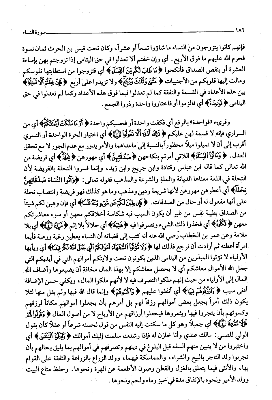 وقرئ «فواحدة» بالرفع أي فكفت واحدة أو فحسبكم واحدة أَوْ ما مَلَكَتْ أَيْمانُكُمْ أي من السراري فإنه لا قسمة لهن عليكم ذلِكَ أَدْنى أَلَّا تَعُولُوا (3) أي اختيار الحرة الواحدة أو التسري أقرب إلى أن لا تميلوا ميلا محظورا بالنسبة إلى ما عداهما والأمر يدور مع عدم الجور لا مع تحقق العدل. وَآتُوا النِّساءَ اللاتي أمرتم بنكاحهن صَدُقاتِهِنَّ أي مهورهن نِحْلَةً أي فريضة من الله تعالى كما قاله ابن عباس وقتادة وابن جريج وابن زيد، وإنما فسروا النحلة بالفريضة لأن النحلة في اللغة معناها الديانة والملة والشرعة والمذهب فقوله تعالى: وَآتُوا النِّساءَ صَدُقاتِهِنَّ نِحْلَةً أي أعطوهن مهورهن لأنها شريعة ودين ومذهب وما هو كذلك فهو فريضة وانتصاب نحلة على أنها مفعول له أو حال من الصدقات. فَإِنْ طِبْنَ لَكُمْ عَنْ شَيْءٍ مِنْهُ نَفْساً أي فإن وهبن لكم شيئا من الصداق بطيبة نفس من غير أن يكون السبب فيه شكاسة أخلاقكم معهن أو سوء معاشرتكم معهن فَكُلُوهُ أي فخذوا ذلك الشيء وتصرفوا فيه هَنِيئاً أي حلالا بلا إثم مَرِيئاً (4) أي بلا ملامة وعن عمر بن الخطاب رضي الله عنه أنه كتب إلى قضاته أن النساء يعطين رغبة ورهبة فأيما امرأة أعطته ثم أرادت أن ترجع فذلك لها وَلا تُؤْتُوا السُّفَهاءَ أَمْوالَكُمُ الَّتِي جَعَلَ اللَّهُ لَكُمْ قِياماً أي ويا أيها الأولياء لا تؤتوا المبذرين من اليتامى الذين يكونون تحت ولايتكم أموالهم التي في أيديكم التي جعل الله الأموال معاشكم أي لا يحصل معاشكم إلا بهذا المال مخافة أن يضيعوها وأضاف الله المال إلى الأولياء من حيث إنهم ملكوا التصرف فيه لا لأنهم ملكوا المال، ويكفي حسن الإضافة أدنى سبب وَارْزُقُوهُمْ فِيها أي أنفقوا عليهم وَاكْسُوهُمْ وإنما قال الله فيها ولم يقل منها لئلا يكون ذلك أمرا بجعل بعض أموالهم رزقا لهم بل أمرهم بأن يجعلوا أموالهم مكانا لرزقهم وكسوتهم بأن يتجروا فيها ويثمروها فيجعلوا أرزاقهم من الأرباح لا من أصول المال وَقُولُوا لَهُمْ قَوْلًا مَعْرُوفاً (5) أي جميلا وهو كل ما سكنت إليه النفس من قول لحسنه شرعا أو عقلا كأن يقول الولي للصبي: مالك عندي وأنا خازن له فإذا رشدت سلمت إليك أموالك وَابْتَلُوا الْيَتامى أي واختبروا من لا يتبين منهم السفه قبل البلوغ في دينهم وتصرفهم في أموالهم بما يليق بحالهم بأن تجربوا ولد التاجر بالبيع والشراء، والمماسكة فيهما، وولد الزراع بالزراعة والنفقة على القوام بها، والأنثى فيما يتعلق بالغزل والقطن وصون الأطعمة عن الهرة ونحوها. وحفظ متاع البيت وولد الأمير ونحوه بالإنفاق مدة في خبز وماء ولحم ونحوها.