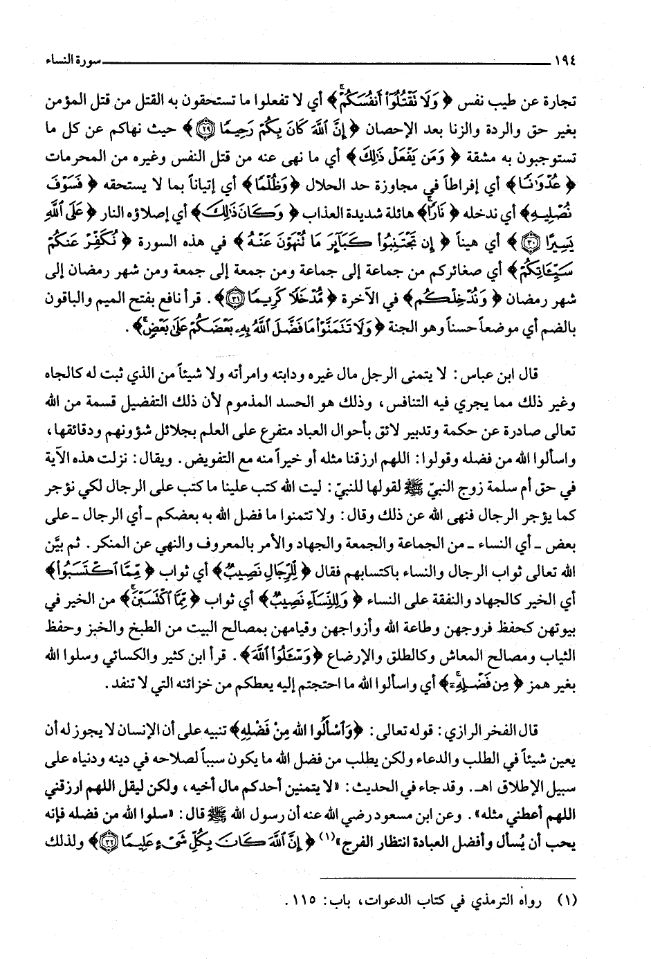 قال ابن عباس: لا يتمنى الرجل مال غيره ودابته وامرأته ولا شيئا من الذي ثبت له كالجاه وغير ذلك مما يجري فيه التنافس، وذلك هو الحسد المذموم لأن ذلك التفضيل قسمة من الله تعالى صادرة عن حكمة وتدبير لائق بأحوال العباد متفرع على العلم بجلائل شؤونهم ودقائقها، واسألوا الله من فضله وقولوا: اللهم ارزقنا مثله أو خيرا منه مع التفويض. ويقال: نزلت هذه الآية في حق أم سلمة زوج النبيّ صلّى الله عليه وسلّم لقولها للنبيّ: ليت الله كتب علينا ما كتب على الرجال لكي نؤجر كما يؤجر الرجال فنهى الله عن ذلك وقال: ولا تتمنوا ما فضل الله به بعضكم- أي الرجال- على بعض- أي النساء- من الجماعة والجمعة والجهاد والأمر بالمعروف والنهي عن المنكر. ثم بيّن الله تعالى ثواب الرجال والنساء باكتسابهم فقال لِلرِّجالِ نَصِيبٌ أي ثواب مِمَّا اكْتَسَبُوا أي الخير كالجهاد والنفقة على النساء وَلِلنِّساءِ نَصِيبٌ أي ثواب مِمَّا اكْتَسَبْنَ من الخير في بيوتهن كحفظ فروجهن وطاعة الله وأزواجهن وقيامهن بمصالح البيت من الطبخ والخبز وحفظ الثياب ومصالح المعاش وكالطلق والإرضاع وَسْئَلُوا اللَّهَ. قرأ ابن كثير والكسائي وسلوا الله بغير همز مِنْ فَضْلِهِ أي واسألوا الله ما احتجتم إليه يعطكم من خزائنه التي لا تنفد.