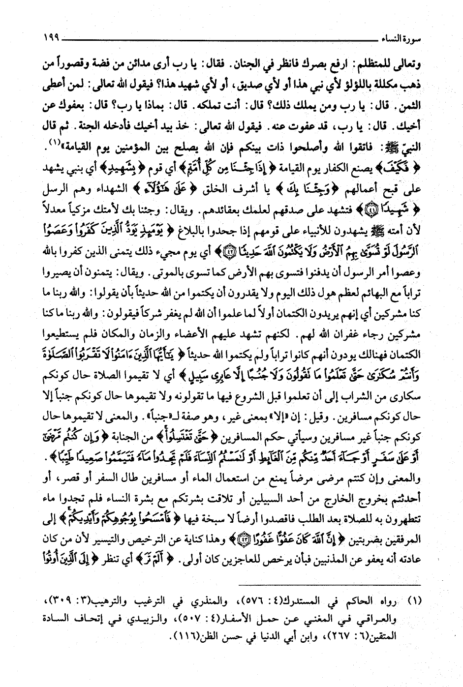 فَكَيْفَ يصنع الكفار يوم القيامة إِذا جِئْنا مِنْ كُلِّ أُمَّةٍ أي قوم بِشَهِيدٍ أي بنبي يشهد على قبح أعمالهم وَجِئْنا بِكَ يا أشرف الخلق عَلى هؤُلاءِ الشهداء وهم الرسل شَهِيداً (41) فتشهد على صدقهم لعلمك بعقائدهم. ويقال: وجئنا بك لأمتك مزكيا معدلا لأن أمته صلّى الله عليه وسلّم يشهدون للأنبياء على قومهم إذا جحدوا بالبلاغ يَوْمَئِذٍ يَوَدُّ الَّذِينَ كَفَرُوا وَعَصَوُا الرَّسُولَ لَوْ تُسَوَّى بِهِمُ الْأَرْضُ وَلا يَكْتُمُونَ اللَّهَ حَدِيثاً (42) أي يوم مجيء ذلك يتمنى الذين كفروا بالله وعصوا أمر الرسول أن يدفنوا فتسوى بهم الأرض كما تسوى بالموتى. ويقال: يتمنون أن يصيروا ترابا مع البهائم لعظم هول ذلك اليوم ولا يقدرون أن يكتموا من الله حديثا بأن يقولوا: والله ربنا ما كنا مشركين أي إنهم يريدون الكتمان أولا لما علموا أن الله لم يغفر شركا فيقولون: والله ربنا ما كنا مشركين رجاء غفران الله لهم. لكنهم تشهد عليهم الأعضاء والزمان والمكان فلم يستطيعوا الكتمان فهنالك يودون أنهم كانوا ترابا ولم يكتموا الله حديثا يا أَيُّهَا الَّذِينَ آمَنُوا لا تَقْرَبُوا الصَّلاةَ وَأَنْتُمْ سُكارى حَتَّى تَعْلَمُوا ما تَقُولُونَ وَلا جُنُباً إِلَّا عابِرِي سَبِيلٍ أي لا تقيموا الصلاة حال كونكم سكارى من الشراب إلى أن تعلموا قبل الشروع فيها ما تقولونه ولا تقيموها حال كونكم جنبا إلا حال كونكم مسافرين. وقيل: إن «إلا» بمعنى غير، وهو صفة ل «جنبا» . والمعنى لا تقيموها حال كونكم جنبا غير مسافرين وسيأتي حكم المسافرين حَتَّى تَغْتَسِلُوا من الجنابة وَإِنْ كُنْتُمْ مَرْضى أَوْ عَلى سَفَرٍ أَوْ جاءَ أَحَدٌ مِنْكُمْ مِنَ الْغائِطِ أَوْ لامَسْتُمُ النِّساءَ فَلَمْ تَجِدُوا ماءً فَتَيَمَّمُوا صَعِيداً طَيِّباً.