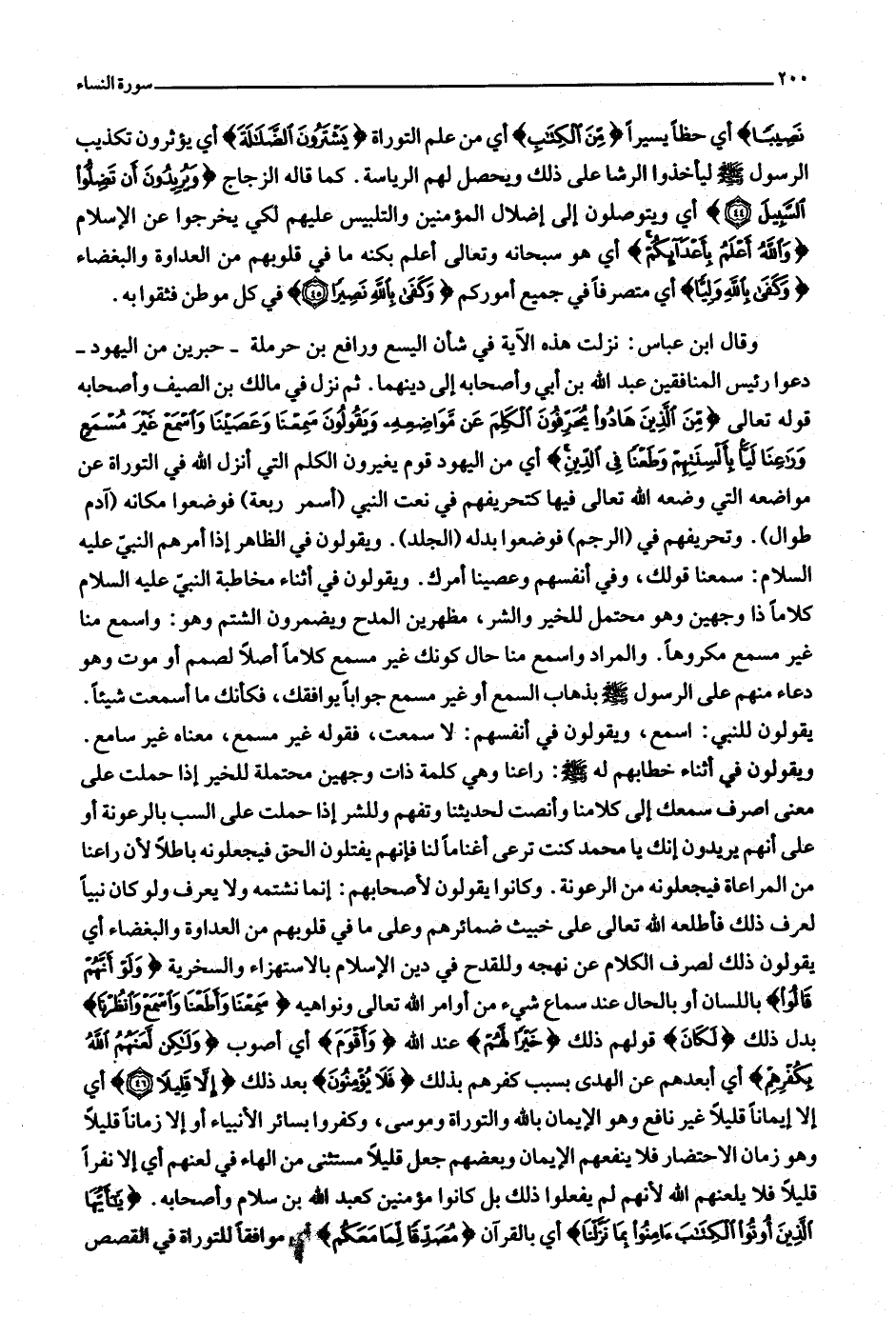 ويقولون في أثناء خطابهم له صلّى الله عليه وسلّم: راعنا وهي كلمة ذات وجهين محتملة للخير إذا حملت على معنى اصرف سمعك إلى كلامنا وأنصت لحديثنا وتفهم وللشر إذا حملت على السب بالرعونة أو على أنهم يريدون إنك يا محمد كنت ترعى أغناما لنا فإنهم يفتلون الحق فيجعلونه باطلا لأن راعنا من المراعاة فيجعلونه من الرعونة. وكانوا يقولون لأصحابهم: إنما نشتمه ولا يعرف ولو كان نبيا لعرف ذلك فأطلعه الله تعالى على خبيث ضمائرهم وعلى ما في قلوبهم من العداوة والبغضاء أي يقولون ذلك لصرف الكلام عن نهجه وللقدح في دين الإسلام بالاستهزاء والسخرية وَلَوْ أَنَّهُمْ قالُوا باللسان أو بالحال عند سماع شيء من أوامر الله تعالى ونواهيه سَمِعْنا وَأَطَعْنا وَاسْمَعْ وَانْظُرْنا بدل ذلك لَكانَ قولهم ذلك خَيْراً لَهُمْ عند الله وَأَقْوَمَ أي أصوب وَلكِنْ لَعَنَهُمُ اللَّهُ بِكُفْرِهِمْ أي أبعدهم عن الهدى بسبب كفرهم بذلك فَلا يُؤْمِنُونَ بعد ذلك إِلَّا قَلِيلًا (46) أي إلا إيمانا قليلا غير نافع وهو الإيمان بالله والتوراة وموسى، وكفروا بسائر الأنبياء أو إلا زمانا قليلا وهو زمان الاحتضار فلا ينفعهم الإيمان وبعضهم جعل قليلا مستثنى من الهاء في لعنهم أي إلا نفرا قليلا فلا يلعنهم الله لأنهم لم يفعلوا ذلك بل كانوا مؤمنين كعبد الله بن سلام وأصحابه. يا أَيُّهَا الَّذِينَ أُوتُوا الْكِتابَ آمِنُوا بِما نَزَّلْنا أي بالقرآن مُصَدِّقاً لِما مَعَكُمْ أي موافقا للتوراة في القصص