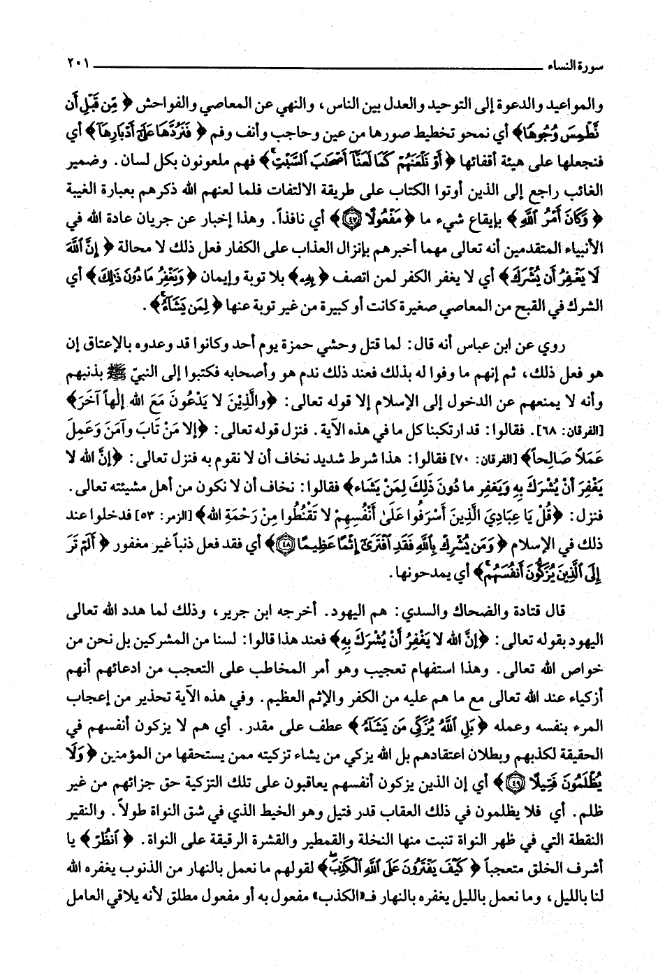 فنزل: قُلْ يا عِبادِيَ الَّذِينَ أَسْرَفُوا عَلى أَنْفُسِهِمْ لا تَقْنَطُوا مِنْ رَحْمَةِ اللَّهِ [الزمر: 53] فدخلوا عند ذلك في الإسلام وَمَنْ يُشْرِكْ بِاللَّهِ فَقَدِ افْتَرى إِثْماً عَظِيماً (48) أي فقد فعل ذنبا غير مغفور أَلَمْ تَرَ إِلَى الَّذِينَ يُزَكُّونَ أَنْفُسَهُمْ أي يمدحونها.