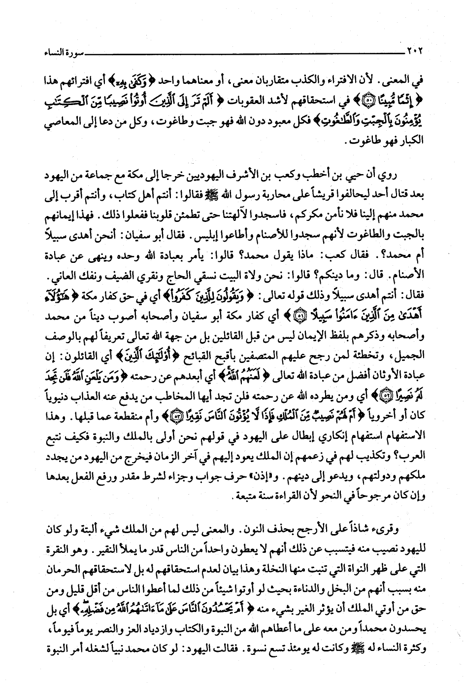 روي أن حيي بن أخطب وكعب بن الأشرف اليهوديين خرجا إلى مكة مع جماعة من اليهود بعد قتال أحد ليحالفوا قريشا على محاربة رسول الله صلّى الله عليه وسلّم فقالوا: أنتم أهل كتاب، وأنتم أقرب إلى محمد منهم إلينا فلا نأمن مكركم، فاسجدوا لآلهتنا حتى تطمئن قلوبنا ففعلوا ذلك. فهذا إيمانهم بالجبت والطاغوت لأنهم سجدوا للأصنام وأطاعوا إبليس. فقال أبو سفيان: أنحن أهدى سبيلا أم محمد؟. فقال كعب: ماذا يقول محمد؟ قالوا: يأمر بعبادة الله وحده وينهى عن عبادة الأصنام. قال: وما دينكم؟ قالوا: نحن ولاة البيت نسقي الحاج ونقري الضيف ونفك العاني.