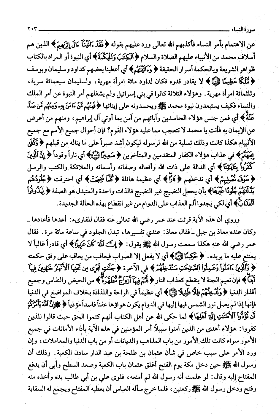 وروي أن هذه الآية قرئت عند عمر رضي الله تعالى عنه فقال للقارئ: أعدها فأعادها- وكان عنده معاذ بن جبل- فقال معاذ: عندي تفسيرها، تبدل الجلود في ساعة مائة مرة. فقال عمر رضي الله عنه هكذا سمعت رسول الله صلّى الله عليه وسلّم يقول: إِنَّ اللَّهَ كانَ عَزِيزاً أي قادرا غالبا لا يمتنع عليه ما يريده. حَكِيماً (56) أي لا يفعل إلا الصواب فيعاقب من يعاقبه على وفق حكمته وَالَّذِينَ آمَنُوا وَعَمِلُوا الصَّالِحاتِ سَنُدْخِلُهُمْ في الآخرة جَنَّاتٍ تَجْرِي مِنْ تَحْتِهَا الْأَنْهارُ خالِدِينَ فِيها أَبَداً فإن نعيم الجنة لا ينقطع كعذاب النار لَهُمْ فِيها أَزْواجٌ مُطَهَّرَةٌ من الحيض والنفاس وجميع أقذار الدنيا وَنُدْخِلُهُمْ ظِلًّا ظَلِيلًا (57) أي عظيما في الراحة واللذاذة بخلاف المواضع في الدنيا فإنها إذا لم يصل نور الشمس فيها إليها في الدوام يكون هواؤها عفنا فاسدا مؤذيا إِنَّ اللَّهَ يَأْمُرُكُمْ أَنْ تُؤَدُّوا الْأَماناتِ إِلى أَهْلِها لما حكى الله عن أهل الكتاب أنهم كتموا الحق حيث قالوا للذين كفروا: هؤلاء أهدى من الذين آمنوا سبيلا أمر المؤمنين في هذه الآية بأداء الأمانات في جميع الأمور سواء كانت تلك الأمور من باب المذاهب والديانات أو من باب الدنيا والمعاملات، وإن ورد الأمر على سبب خاص في شأن عثمان بن طلحة بن عبد الدار سادن الكعبة. وذلك أن رسول الله صلّى الله عليه وسلّم حين دخل مكة يوم الفتح أغلق عثمان باب الكعبة وصعد السطح وأبى أن يدفع المفتاح إليه وقال: لو علمت أنه رسول الله لم أمنعه، فلوى علي بن أبي طالب يده وأخذه منه وفتح ودخل رسول الله صلّى الله عليه وسلّم ركعتين، فلما خرج سأله العباس أن يعطيه المفتاح ويجمع له السقاية