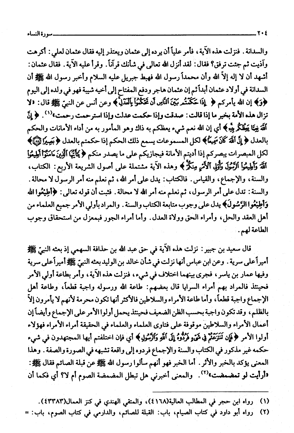 «1» . إِنَّ اللَّهَ نِعِمَّا يَعِظُكُمْ بِهِ أي إن الله نعم شيء يعظكم به ذاك وهو المأمور به من أداء الأمانات والحكم بالعدل إِنَّ اللَّهَ كانَ سَمِيعاً لكل المسموعات يسمع ذلك الحكم إذا حكمتم بالعدل بَصِيراً (58) لكل المبصرات يبصركم إذا أديتم الأمانة فيجازيكم على ما يصدر منكم يا أَيُّهَا الَّذِينَ آمَنُوا أَطِيعُوا اللَّهَ وَأَطِيعُوا الرَّسُولَ وَأُولِي الْأَمْرِ مِنْكُمْ وهذه الآية مشتملة على أصول الشريعة الأربع: الكتاب، والسنة، والإجماع، والقياس. فالكتاب: يدل على أمر الله، ثم نعلم منه أمر الرسول لا محالة.