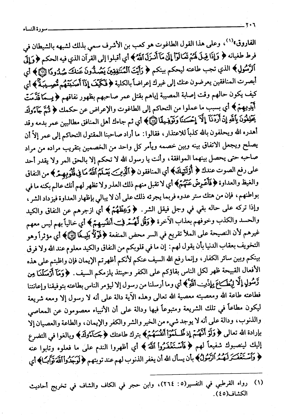 وَإِذا قِيلَ لَهُمْ تَعالَوْا إِلى ما أَنْزَلَ اللَّهُ أي أقبلوا إلى القرآن الذي فيه الحكم وَإِلَى الرَّسُولِ الذي تجب طاعته ليحكم بينكم رَأَيْتَ الْمُنافِقِينَ يَصُدُّونَ عَنْكَ صُدُوداً (61) أي أبصرت المنافقين يعرضون عنك إلى غيرك إعراضا بالكلية فَكَيْفَ إِذا أَصابَتْهُمْ مُصِيبَةٌ أي كيف يكون حالهم وقت إصابة المصيبة إياهم بقتل عمر صاحبهم بظهور نفاقهم بِما قَدَّمَتْ أَيْدِيهِمْ أي بسبب ما عملوا من التحاكم إلى الطاغوت والإعراض عن حكمك ثُمَّ جاؤُكَ يَحْلِفُونَ بِاللَّهِ إِنْ أَرَدْنا إِلَّا إِحْساناً وَتَوْفِيقاً (62) أي ثم جاءك أهل المنافق مطالبين عمر بدمه وقد أهدره الله ويحلفون بالله كذبا للاعتذار، فقالوا: ما أراد صاحبنا المقتول التحاكم إلى عمر إلّا أن يصلح ويجعل الاتفاق بينه وبين خصمه ويأمر كل واحد من الخصمين بتقريب مراده من مراد صاحبه حتى يحصل بينهما الموافقة، وأنت يا رسول الله لا تحكم إلا بالحق المر ولا يقدر أحد على رفع الصوت عندك أُولئِكَ أي المنافقون الَّذِينَ يَعْلَمُ اللَّهُ ما فِي قُلُوبِهِمْ من النفاق والغيظ والعداوة فَأَعْرِضْ عَنْهُمْ أي لا تقبل منهم ذلك العذر ولا تظهر لهم أنك عالم بكنه ما في بواطنهم، فإن من هتك ستر عدوه فربما يجرئه ذلك على أن لا يبالي بإظهار العداوة فيزداد الشر، وإذا تركه على حاله بقي في وجل فيقل الشر. وَعِظْهُمْ أي ازجرهم عن النفاق والكيد والحسد والكذب وخوفهم بعذاب الآخرة وَقُلْ لَهُمْ فِي أَنْفُسِهِمْ أي خاليا بهم ليس معهم غيرهم لأن النصيحة على الملأ تقريع في السر محض المنفعة قَوْلًا بَلِيغاً (63) أي مؤثرا وهو التخويف بعقاب الدنيا بأن يقول لهم: إن ما في قلوبكم من النفاق والكيد معلوم عند الله ولا فرق بينكم وبين سائر الكفار، وإنما رفع الله السيف عنكم لأنكم أظهرتم الإيمان فإن واظبتم على هذه الأفعال القبيحة ظهر لكل الناس بقاؤكم على الكفر وحينئذ يلزمكم السيف. وَما أَرْسَلْنا مِنْ رَسُولٍ إِلَّا لِيُطاعَ بِإِذْنِ اللَّهِ أي وما أرسلنا من رسول إلا ليؤمر الناس بطاعته بتوفيقنا وإعانتنا فطاعته طاعة الله ومعصيته معصية الله تعالى وهذه الآية دالة على أنه لا رسول إلا ومعه شريعة ليكون مطاعا في تلك الشريعة ومتبوعا فيها ودالة على أن الأنبياء معصومون عن المعاصي والذنوب، ودالة على أنه لا يوجد شيء من الخير والشر والكفر والإيمان، والطاعة والعصيان إلا بإرادة الله تعالى وَلَوْ أَنَّهُمْ إِذْ ظَلَمُوا أَنْفُسَهُمْ بترك طاعتك جاؤُكَ وبالغوا في التضرع إليك لينصبوك شفيعا لهم فَاسْتَغْفَرُوا اللَّهَ أي أظهروا الندم على ما فعلوه وتابوا عنه وَاسْتَغْفَرَ لَهُمُ الرَّسُولُ بأن يسأل الله أن يغفر الذنوب لهم عند توبتهم لَوَجَدُوا اللَّهَ تَوَّاباً أي