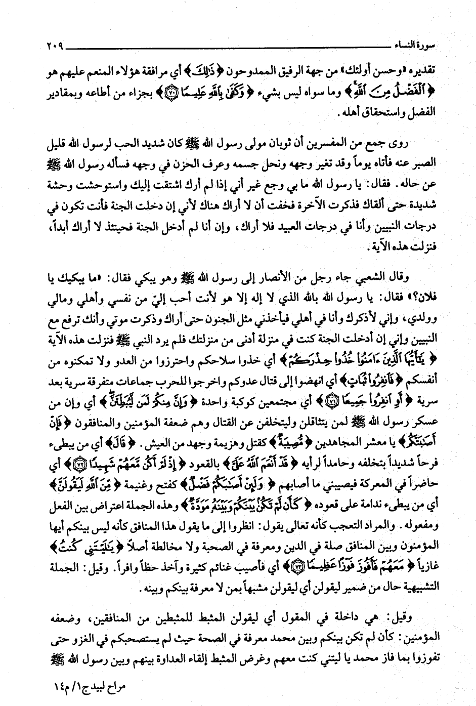 وقال الشعبي جاء رجل من الأنصار إلى رسول الله صلّى الله عليه وسلّم وهو يبكي فقال: «ما يبكيك يا فلان؟» فقال: يا رسول الله بالله الذي لا إله إلا هو لأنت أحب إليّ من نفسي وأهلي ومالي وولدي، وإني لأذكرك وأنا في أهلي فيأخذني مثل الجنون حتى أراك وذكرت موتي وأنك ترفع مع النبيين وإني إن أدخلت الجنة كنت في منزلة أدنى من منزلتك فلم يرد النبي صلّى الله عليه وسلّم فنزلت هذه الآية