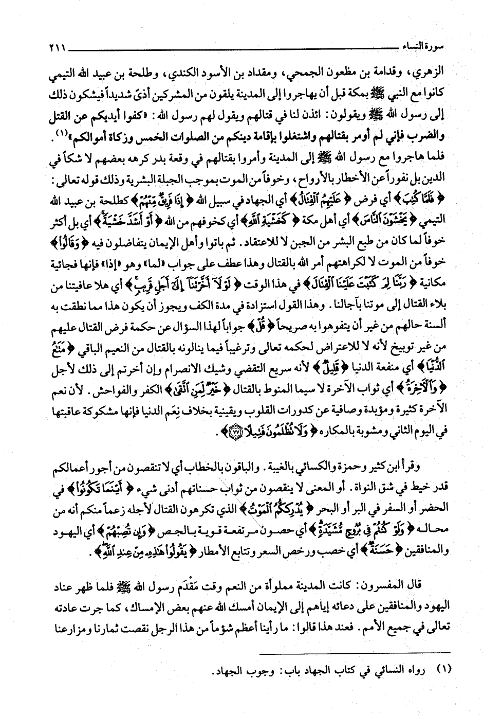فَلَمَّا كُتِبَ أي فرض عَلَيْهِمُ الْقِتالُ أي الجهاد في سبيل الله إِذا فَرِيقٌ مِنْهُمْ كطلحة بن عبيد الله التيمي يَخْشَوْنَ النَّاسَ أي أهل مكة كَخَشْيَةِ اللَّهِ أي كخوفهم من الله أَوْ أَشَدَّ خَشْيَةً أي بل أكثر خوفا لما كان من طبع البشر من الجبن لا للاعتقاد. ثم باتوا وأهل الإيمان يتفاضلون فيه وَقالُوا خوفا من الموت لا لكراهتهم أمر الله بالقتال وهذا عطف على جواب «لما» وهو «إذا» فإنها فجائية مكانية رَبَّنا لِمَ كَتَبْتَ عَلَيْنَا الْقِتالَ في هذا الوقت لَوْلا أَخَّرْتَنا إِلى أَجَلٍ قَرِيبٍ أي هلا عافيتنا من بلاء القتال إلى موتنا بآجالنا. وهذا القول استزادة في مدة الكف ويجوز أن يكون هذا مما نطقت به ألسنة حالهم من غير أن يتفوهوا به صريحا قُلْ جوابا لهذا السؤال عن حكمة فرض القتال عليهم من غير توبيخ لأنه لا للاعتراض لحكمه تعالى وترغيبا فيما ينالونه بالقتال من النعيم الباقي مَتاعُ الدُّنْيا أي منفعة الدنيا قَلِيلٌ لأنه سريع التقضي وشيك الانصرام