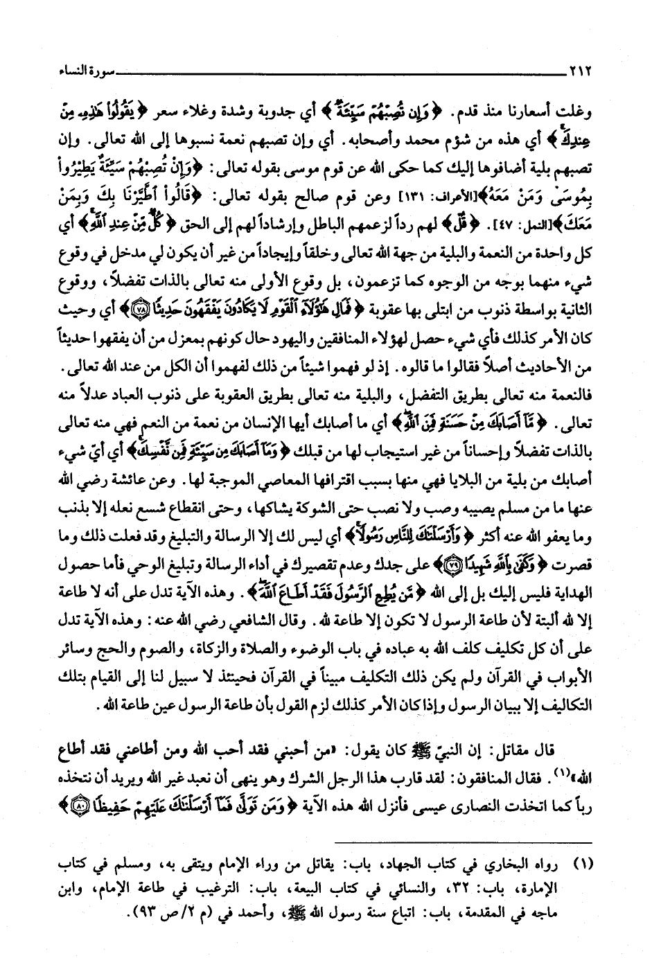 فالنعمة منه تعالى بطريق التفضل، والبلية منه تعالى بطريق العقوبة على ذنوب العباد عدلا منه تعالى. ما أَصابَكَ مِنْ حَسَنَةٍ فَمِنَ اللَّهِ أي ما أصابك أيها الإنسان من نعمة من النعم فهي منه تعالى بالذات تفضلا وإحسانا من غير استيجاب لها من قبلك وَما أَصابَكَ مِنْ سَيِّئَةٍ فَمِنْ نَفْسِكَ أي أيّ شيء أصابك من بلية من البلايا فهي منها بسبب اقترافها المعاصي الموجبة لها. وعن عائشة رضي الله عنها ما من مسلم يصيبه وصب ولا نصب حتى الشوكة يشاكها، وحتى انقطاع شسع نعله إلا بذنب وما يعفو الله عنه أكثر وَأَرْسَلْناكَ لِلنَّاسِ رَسُولًا أي ليس لك إلا الرسالة والتبليغ وقد فعلت ذلك وما قصرت وَكَفى بِاللَّهِ شَهِيداً (79) على جدك وعدم تقصيرك في أداء الرسالة وتبليغ الوحي فأما حصول الهداية فليس إليك بل إلى الله مَنْ يُطِعِ الرَّسُولَ فَقَدْ أَطاعَ اللَّهَ. وهذه الآية تدل على أنه لا طاعة إلّا لله ألبتة لأن طاعة الرسول لا تكون إلا طاعة لله. وقال الشافعي رضي الله عنه: وهذه الآية تدل على أن كل تكليف كلف الله به عباده في باب الوضوء والصلاة والزكاة، والصوم والحج وسائر الأبواب في القرآن ولم يكن ذلك التكليف مبينا في القرآن فحينئذ لا سبيل لنا إلى القيام بتلك التكاليف إلا ببيان الرسول وإذا كان الأمر كذلك لزم القول بأن طاعة الرسول عين طاعة الله.