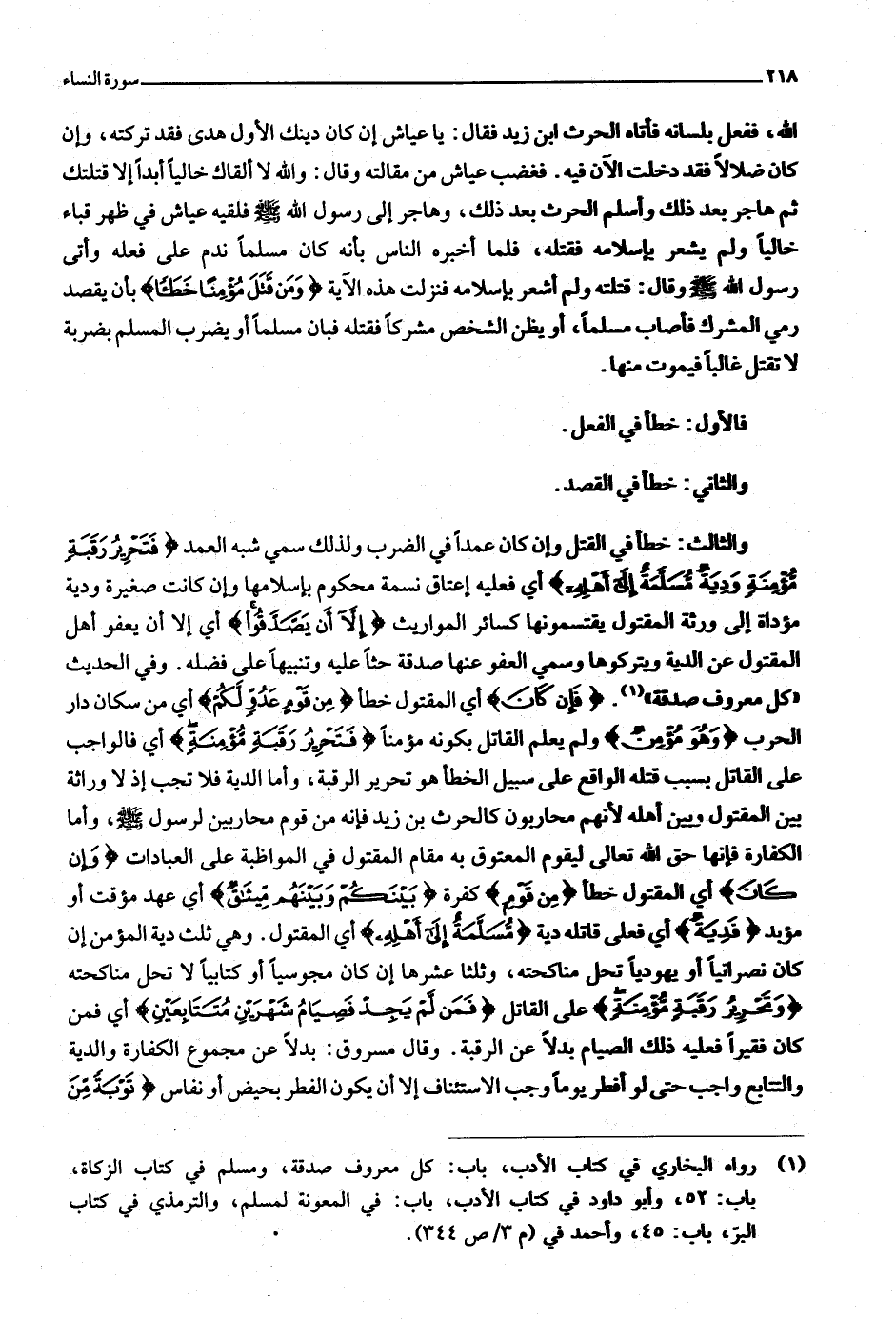 الله، ففعل بلسانه فأتاه الحرث ابن زيد فقال: يا عياش إن كان دينك الأول هدى فقد تركته، وإن كان ضلالا فقد دخلت الآن فيه. فغضب عياش من مقالته وقال: والله لا ألقاك خاليا أبدا إلا قتلتك ثم هاجر بعد ذلك وأسلم الحرث بعد ذلك، وهاجر إلى رسول الله صلّى الله عليه وسلّم فلقيه عياش في ظهر قباء خاليا ولم يشعر بإسلامه فقتله، فلما أخبره الناس بأنه كان مسلما ندم على فعله وأتى رسول الله صلّى الله عليه وسلّم وقال: قتلته ولم أشعر بإسلامه فنزلت هذه الآية وَمَنْ قَتَلَ مُؤْمِناً خَطَأً بأن يقصد رمي المشرك فأصاب مسلما، أو يظن الشخص مشركا فقتله فبان مسلما أو يضرب المسلم بضربة لا تقتل غالبا فيموت منها.
