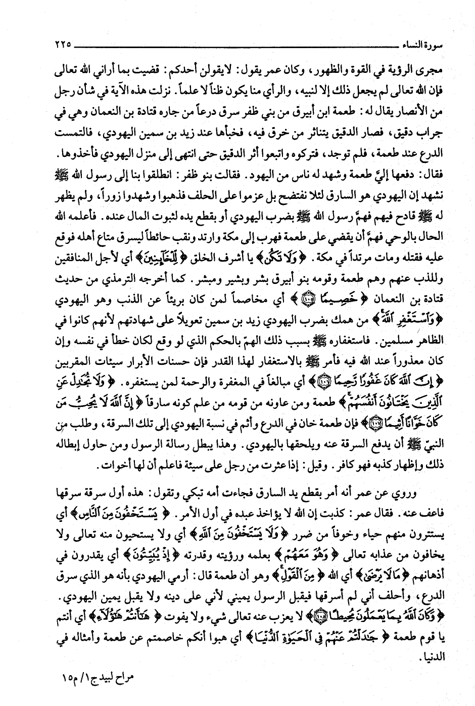 مجرى الرؤية في القوة والظهور، وكان عمر يقول: لا يقولن أحدكم: قضيت بما أراني الله تعالى فإن الله تعالى لم يجعل ذلك إلا لنبيه، والرأي منا يكون ظنا لا علما. نزلت هذه الآية في شأن رجل من الأنصار يقال له: طعمة ابن أبيرق من بني ظفر سرق درعا من جاره قتادة بن النعمان وهي في جراب دقيق، فصار الدقيق يتناثر من خرق فيه، فخبأها عند زيد بن سمين اليهودي، فالتمست الدرع عند طعمة، فلم توجد، فتركوه واتبعوا أثر الدقيق حتى انتهى إلى منزل اليهودي فأخذوها.