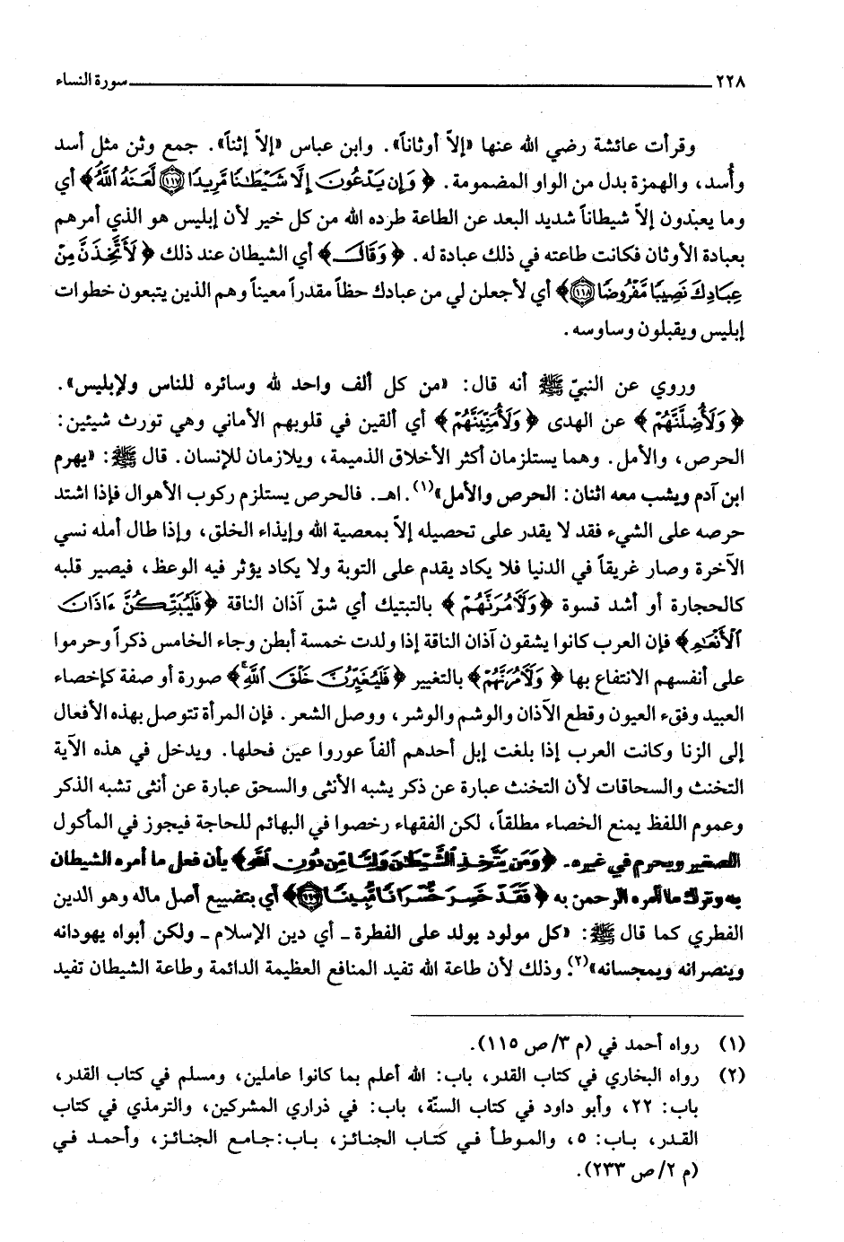 «1» . اه. فالحرص يستلزم ركوب الأهوال فإذا اشتد حرصه على الشيء فقد لا يقدر على تحصيله إلّا بمعصية الله وإيذاء الخلق، وإذا طال أمله نسي الآخرة وصار غريقا في الدنيا فلا يكاد يقدم على التوبة ولا يكاد يؤثر فيه الوعظ، فيصير قلبه كالحجارة أو أشد قسوة وَلَآمُرَنَّهُمْ بالتبتيك أي شق آذان الناقة فَلَيُبَتِّكُنَّ آذانَ الْأَنْعامِ فإن العرب كانوا يشقون آذان الناقة إذا ولدت خمسة أبطن وجاء الخامس ذكرا وحرموا على أنفسهم الانتفاع بها وَلَآمُرَنَّهُمْ بالتغيير فَلَيُغَيِّرُنَّ خَلْقَ اللَّهِ صورة أو صفة كإخصاء العبيد وفقء العيون وقطع الآذان والوشم والوشر، ووصل الشعر. فإن المرأة تتوصل بهذه الأفعال إلى الزنا وكانت العرب إذا بلغت إبل أحدهم ألفا عوروا عين فحلها. ويدخل في هذه الآية التخنث والسحاقات لأن التخنث عبارة عن ذكر يشبه الأنثى والسحق عبارة عن أنثى تشبه الذكر وعموم اللفظ يمنع الخصاء مطلقا، لكن الفقهاء رخصوا في البهائم للحاجة فيجوز في المأكول الصغير وبحرم في غيره. وَمَنْ يَتَّخِذِ الشَّيْطانَ وَلِيًّا مِنْ دُونِ اللَّهِ بأن فعل ما أمره الشيطان به وترك ما أمره الرحمن به فَقَدْ خَسِرَ خُسْراناً مُبِيناً (119) أي بتضييع أصل ماله وهو الدين الفطري كما