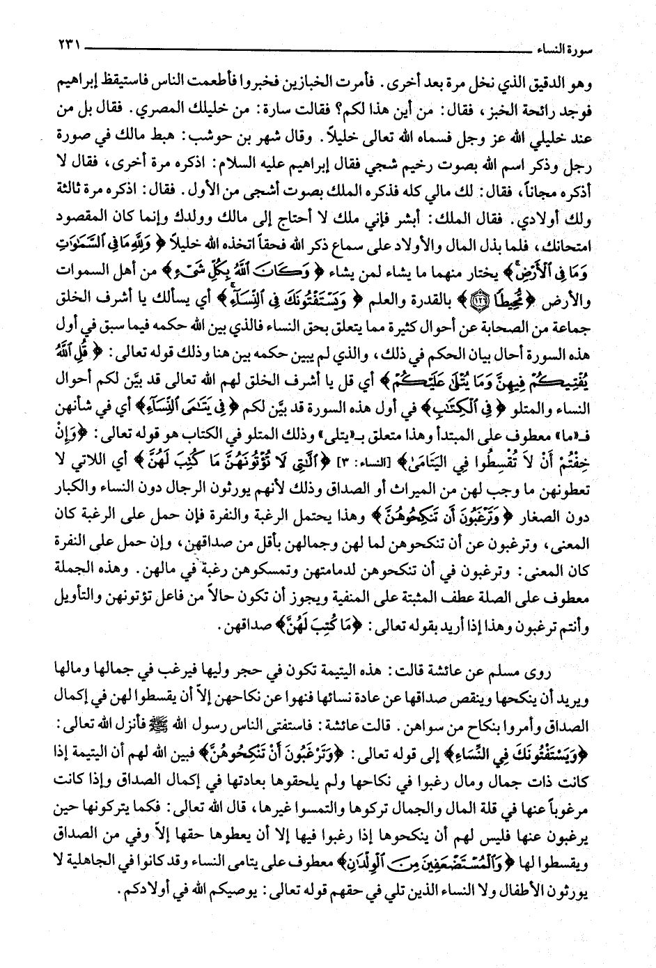 وَيَسْتَفْتُونَكَ فِي النِّساءِ إلى قوله تعالى: وَتَرْغَبُونَ أَنْ تَنْكِحُوهُنَّ فبين الله لهم أن اليتيمة إذا كانت ذات جمال ومال رغبوا في نكاحها ولم يلحقوها بعادتها في إكمال الصداق وإذا كانت مرغوبا عنها في قلة المال والجمال تركوها والتمسوا غيرها، قال الله تعالى: فكما يتركونها حين يرغبون عنها فليس لهم أن ينكحوها إذا رغبوا فيها إلا أن يعطوها حقها إلّا وفي من الصداق ويقسطوا لها وَالْمُسْتَضْعَفِينَ مِنَ الْوِلْدانِ معطوف على يتامى النساء وقد كانوا في الجاهلية لا يورثون الأطفال ولا النساء الذين تلي في حقهم قوله تعالى: يوصيكم الله في أولادكم.
