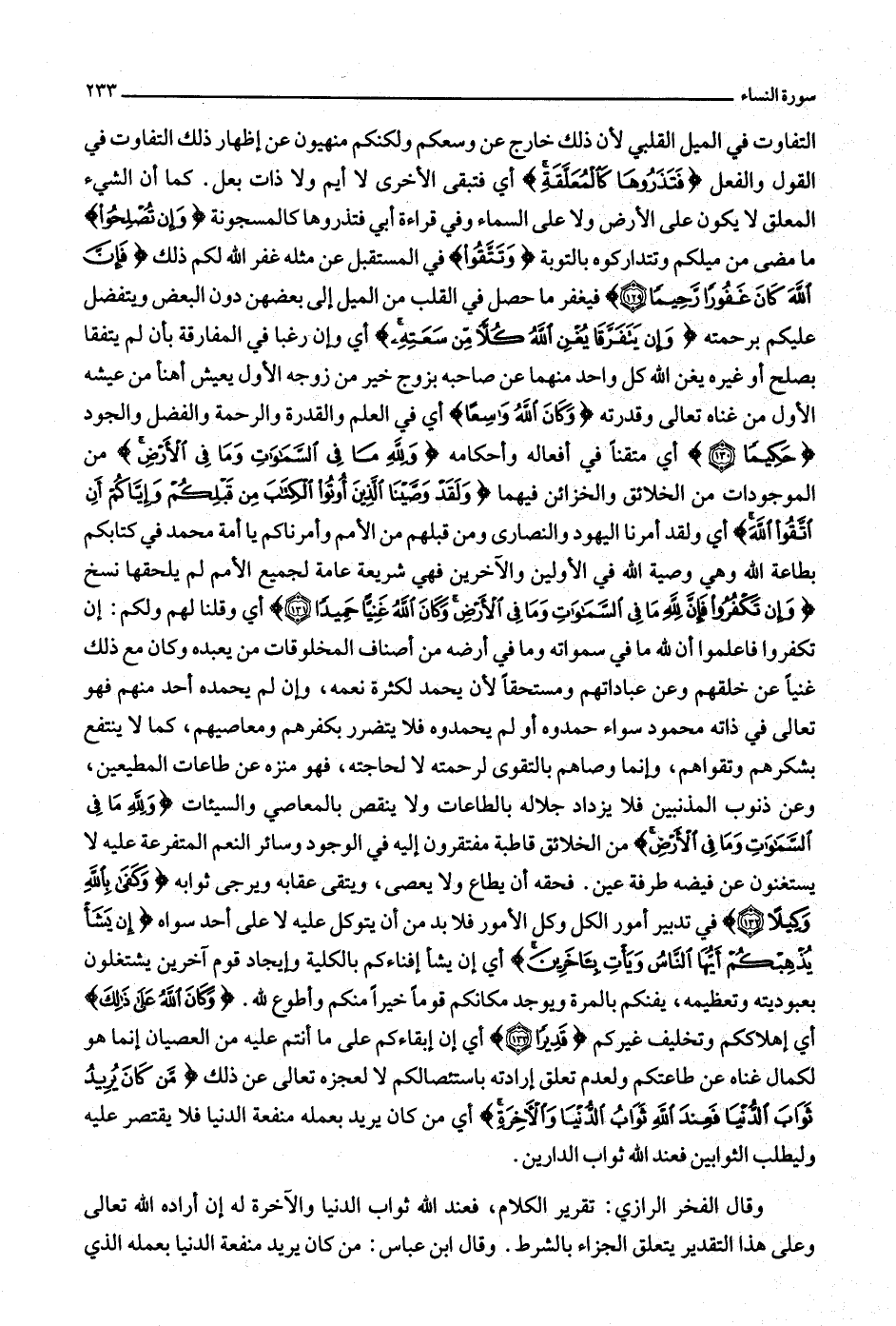 التفاوت في الميل القلبي لأن ذلك خارج عن وسعكم ولكنكم منهيون عن إظهار ذلك التفاوت في القول والفعل فَتَذَرُوها كَالْمُعَلَّقَةِ أي فتبقى الأخرى لا أيم ولا ذات بعل. كما أن الشيء المعلق لا يكون على الأرض ولا على السماء وفي قراءة أبي فتذروها كالمسجونة وَإِنْ تُصْلِحُوا ما مضى من ميلكم وتتداركوه بالتوبة وَتَتَّقُوا في المستقبل عن مثله غفر الله لكم ذلك فَإِنَّ اللَّهَ كانَ غَفُوراً رَحِيماً (129) فيغفر ما حصل في القلب من الميل إلى بعضهن دون البعض ويتفضل عليكم برحمته وَإِنْ يَتَفَرَّقا يُغْنِ اللَّهُ كُلًّا مِنْ سَعَتِهِ أي وإن رغبا في المفارقة بأن لم يتفقا بصلح أو غيره يغن الله كل واحد منهما عن صاحبه بزوج خير من زوجه الأول يعيش أهنأ من عيشه الأول من غناه تعالى وقدرته وَكانَ اللَّهُ واسِعاً أي في العلم والقدرة والرحمة والفضل والجود حَكِيماً (130) أي متقنا في أفعاله وأحكامه