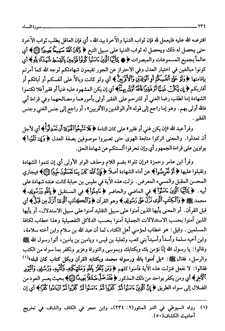 وقرأ ابن عامر وحمزة «وإن تلوا» بضم اللام وحذف الواو الأولى أي إن تتموا الشهادة وتقبلوا عليها أَوْ تُعْرِضُوا عن أداء الشهادة أصلا فَإِنَّ اللَّهَ كانَ بِما تَعْمَلُونَ خَبِيراً (135) فيجازي المحسن المقبل والمسيء المعرض. نزلت هذه الآية في مقيس بن حبابة كانت عنده شهادة على أبيه. يا أَيُّهَا الَّذِينَ آمَنُوا في الماضي والحاضر آمَنُوا في المستقبل بِاللَّهِ وَرَسُولِهِ محمد صلّى الله عليه وسلّم وَالْكِتابِ الَّذِي نَزَّلَ عَلى رَسُولِهِ وهو القرآن وَالْكِتابِ الَّذِي أَنْزَلَ مِنْ قَبْلُ أي قبل القرآن. أو المعنى يا أيها الذين آمنوا على سبيل التقليد آمنوا على سبيل الاستدلال، أو يا أيها الذين آمنوا بحسب الاستدلالات الجملية آمنوا بحسب الدلائل التفصيلية وهذا خطاب لكافة المسلمين.