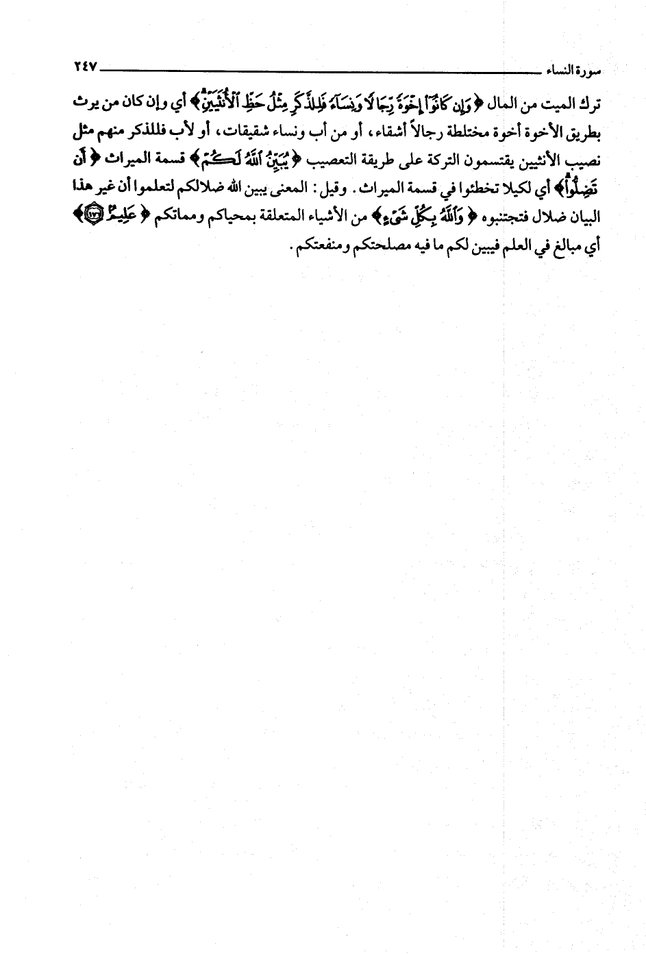 ترك الميت من المال وَإِنْ كانُوا إِخْوَةً رِجالًا وَنِساءً فَلِلذَّكَرِ مِثْلُ حَظِّ الْأُنْثَيَيْنِ أي وإن كان من يرث بطريق الأخوة أخوة مختلطة رجالا أشقاء، أو من أب ونساء شقيقات، أو لأب فللذكر منهم مثل نصيب الأنثيين يقتسمون التركة على طريقة التعصيب يُبَيِّنُ اللَّهُ لَكُمْ قسمة الميراث أَنْ تَضِلُّوا أي لكيلا تخطئوا في قسمة الميراث. وقيل: المعنى يبين الله ضلالكم لتعلموا أن غير هذا البيان ضلال فتجتنبوه وَاللَّهُ بِكُلِّ شَيْءٍ من الأشياء المتعلقة بمحياكم ومماتكم عَلِيمٌ (176) أي مبالغ في العلم فيبين لكم ما فيه مصلحتكم ومنفعتكم.