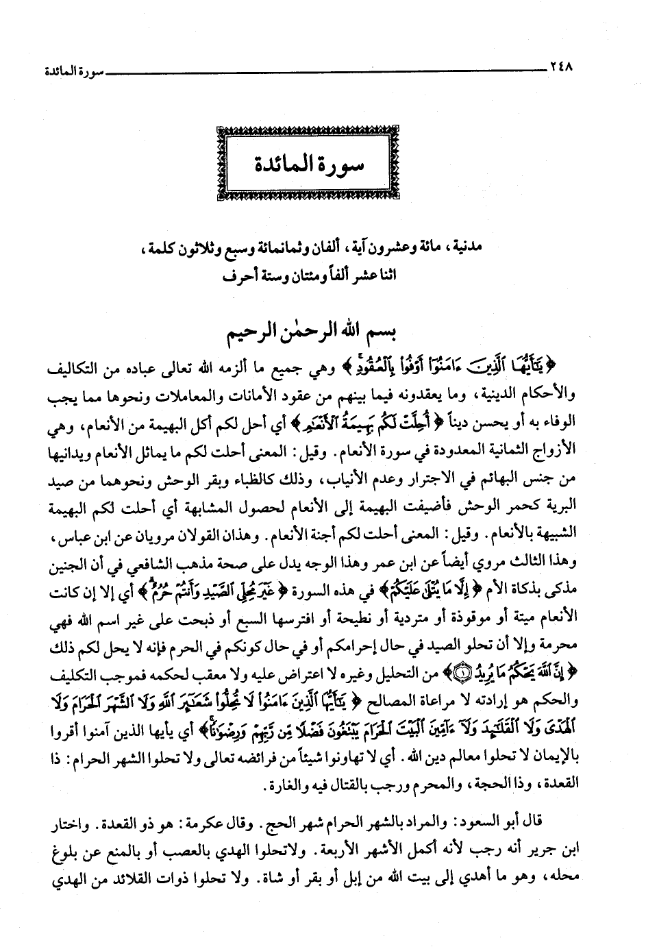 يا أَيُّهَا الَّذِينَ آمَنُوا أَوْفُوا بِالْعُقُودِ وهي جميع ما ألزمه الله تعالى عباده من التكاليف والأحكام الدينية، وما يعقدونه فيما بينهم من عقود الأمانات والمعاملات ونحوها مما يجب الوفاء به أو يحسن دينا أُحِلَّتْ لَكُمْ بَهِيمَةُ الْأَنْعامِ أي أحل لكم أحل البهيمة من الأنعام، وهي الأزواج الثمانية المعدودة في سورة الأنعام. وقيل: المعنى أحلت لكم ما يماثل الأنعام ويدانيها من جنس البهائم في الاجترار وعدم الأنياب، وذلك كالظباء وبقر الوحش ونحوهما من صيد البرية كحمر الوحش فأضيفت البهيمة إلى الأنعام لحصول المشابهة أي أحلت لكم البهيمة الشبيهة بالأنعام. وقيل: المعنى أحلت لكم أجنة الأنعام. وهذان القولان مرويان عن ابن عباس، وهذا الثالث مروي أيضا عن ابن عمر وهذا الوجه يدل على صحة مذهب الشافعي في أن الجنين مذكى بذكاة الأم إِلَّا ما يُتْلى عَلَيْكُمْ في هذه السورة غَيْرَ مُحِلِّي الصَّيْدِ وَأَنْتُمْ حُرُمٌ أي إلا إن كانت الأنعام ميتة أو موقوذة أو متردية أو نطيحة أو افترسها السبع أو ذبحت على غير اسم الله فهي محرمة وإلا أن تحلوا الصيد في حال إحرامكم أو في حال كونكم في الحرم فإنه لا يحل لكم ذلك إِنَّ اللَّهَ يَحْكُمُ ما يُرِيدُ (1) من التحليل وغيره لا اعتراض عليه ولا معقب لحكمه فموجب التكليف والحكم هو إرادته لا مراعاة المصالح يا أَيُّهَا الَّذِينَ آمَنُوا لا تُحِلُّوا شَعائِرَ اللَّهِ وَلَا الشَّهْرَ الْحَرامَ وَلَا الْهَدْيَ وَلَا الْقَلائِدَ وَلَا آمِّينَ الْبَيْتَ الْحَرامَ يَبْتَغُونَ فَضْلًا مِنْ رَبِّهِمْ وَرِضْواناً أي يا أيها الذين آمنوا أقروا بالإيمان لا تحلوا معالم دين الله. أي لا تهاونوا شيئا من فرائضه تعالى ولا تحلوا الشهر الحرام: ذا القعدة، وذا الحجة، والمحرم ورجب بالقتال فيه والغارة.