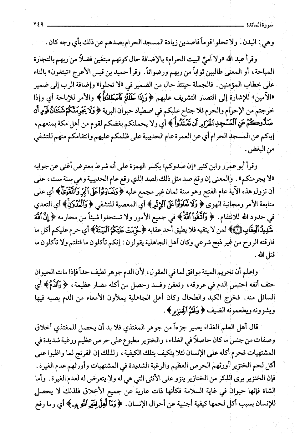 وقرأ أبو عمرو وابن كثير «إن صدوكم» بكسر الهمزة على أنه شرط معترض أغنى عن جوابه «لا يجرمنكم» . والمعنى إن وقع صد مثل ذلك الصد الذي وقع عام الحديبية وهي سنة ست، على أن نزول هذه الآية عام الفتح وهو سنة ثمان غير مجمع عليه وَتَعاوَنُوا عَلَى الْبِرِّ وَالتَّقْوى أي على متابعة الأمر ومجانبة الهوى وَلا تَعاوَنُوا عَلَى الْإِثْمِ أي المعصية للتشفي وَالْعُدْوانِ أي التعدي في حدود الله للانتقام. وَاتَّقُوا اللَّهَ في جميع الأمور ولا تستحلوا شيئا من محارمه إِنَّ اللَّهَ شَدِيدُ الْعِقابِ (2) لمن لا يتقيه فلا يطيق أحد عقابه حُرِّمَتْ عَلَيْكُمُ الْمَيْتَةُ أي حرم عليكم أكل ما فارقته الروح من غير ذبح شرعي وكان أهل الجاهلية يقولون: إنكم تأكلون ما قتلتم ولا تأكلون ما قتل الله.