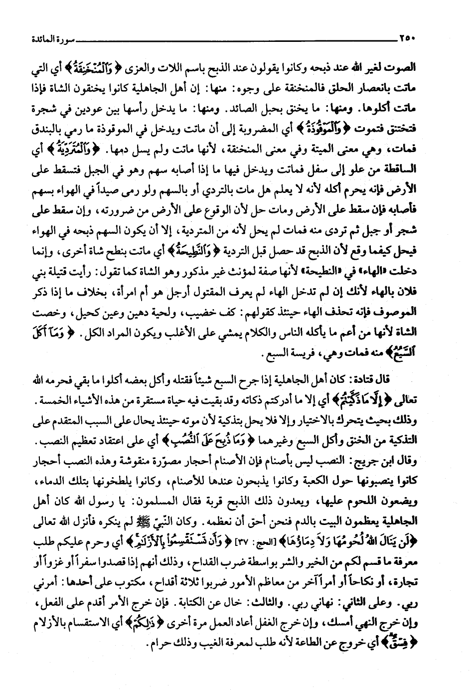 الصوت لغير الله عند ذبحه وكانوا يقولون عند الذبح باسم اللات والعزى وَالْمُنْخَنِقَةُ أي التي ماتت بانعصار الحلق فالمنخنقة على وجوه: منها: إن أهل الجاهلية كانوا يخنقون الشاة فإذا ماتت أكلوها. ومنها: ما يخنق بحبل الصائد. ومنها: ما يدخل رأسها بين عودين في شجرة فتختنق فتموت وَالْمَوْقُوذَةُ أي المضروبة إلى أن ماتت ويدخل في الموقوذة ما رمي بالبندق فمات، وهي معنى الميتة وفي معنى المنخنقة، لأنها ماتت ولم يسل دمها. وَالْمُتَرَدِّيَةُ أي الساقطة من علو إلى سفل فماتت ويدخل فيها ما إذا أصابه سهم وهو في الجبل فتسقط على الأرض فإنه يحرم أكله لأنه لا يعلم هل مات بالتردي أو بالسهم ولو رمى صيدا في الهواء بسهم فأصابه فإن سقط على الأرض ومات حل لأن الوقوع على الأرض من ضرورته، وإن سقط على شجر أو جبل ثم تردى منه فمات لم يحل لأنه من المتردية، إلا أن يكون السهم ذبحه في الهواء فيحل كيفما وقع لأن الذبح قد حصل قبل التردية وَالنَّطِيحَةُ أي ماتت بنطح شاة أخرى، وإنما دخلت «الهاء» في «النطيحة» لأنها صفة لمؤنث غير مذكور وهو الشاة كما تقول: رأيت قتيلة بني فلان بالهاء لأنك إن لم تدخل الهاء لم يعرف المقتول أرجل هو أم امرأة، بخلاف ما إذا ذكر الموصوف فإنه تحذف الهاء حينئذ كقولهم: كف خضيب، ولحية دهين وعين كحيل، وخصت الشاة لأنها من أعم ما يأكله الناس والكلام يمشي على الأغلب ويكون المراد الكل. وَما أَكَلَ السَّبُعُ منه فمات وهي، فريسة السبع.