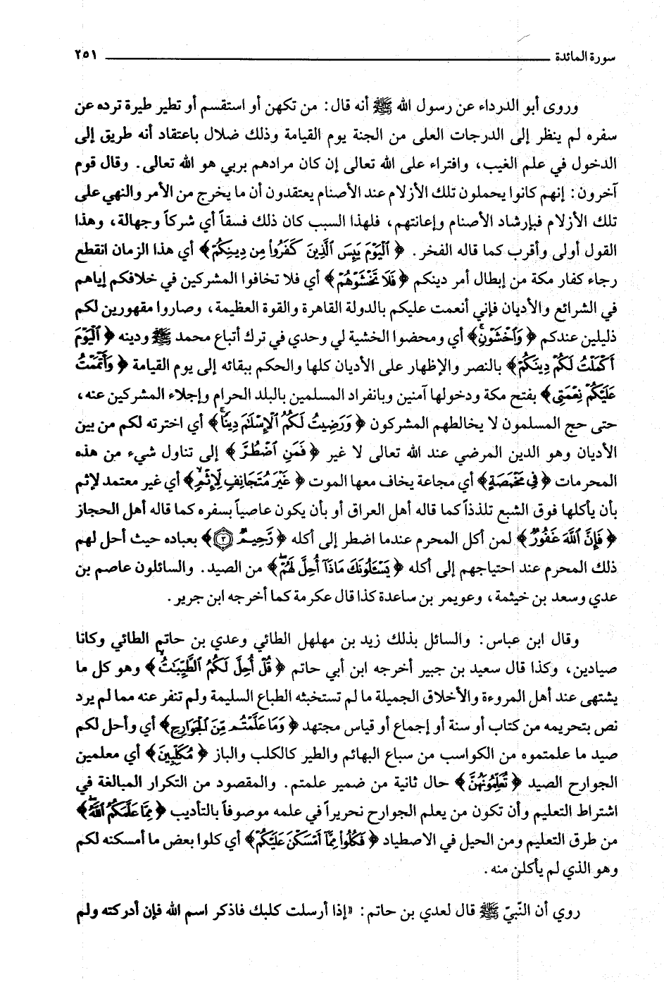 وذلك ضلال باعتقاد أنه طريق إلى الدخول في علم الغيب، وافتراء على الله تعالى إن كان مرادهم بربي هو الله تعالى. وقال قوم آخرون: إنهم كانوا يحملون تلك الأزلام عند الأصنام يعتقدون أن ما يخرج من الأمر والنهي على تلك الأزلام فبإرشاد الأصنام وإعانتهم، فلهذا السبب كان ذلك فسقا أي شركا وجهالة، وهذا القول أولى وأقرب كما قاله الفخر. الْيَوْمَ يَئِسَ الَّذِينَ كَفَرُوا مِنْ دِينِكُمْ أي هذا الزمان انقطع رجاء كفار مكة من إبطال أمر دينكم فَلا تَخْشَوْهُمْ أي فلا تخافوا المشركين في خلافكم إياهم في الشرائع والأديان فإني أنعمت عليكم بالدولة القاهرة والقوة العظيمة، وصاروا مقهورين لكم ذليلين عندكم وَاخْشَوْنِ أي ومحضوا الخشية لي وحدي في ترك أتباع محمد صلّى الله عليه وسلّم ودينه الْيَوْمَ أَكْمَلْتُ لَكُمْ دِينَكُمْ بالنصر والإظهار على الأديان كلها والحكم ببقائه إلى يوم القيامة وَأَتْمَمْتُ عَلَيْكُمْ نِعْمَتِي بفتح مكة ودخولها آمنين وبانفراد المسلمين بالبلد الحرام وإجلاء المشركين عنه، حتى حج المسلمون لا يخالطهم المشركون وَرَضِيتُ لَكُمُ الْإِسْلامَ دِيناً أي اخترته لكم من بين الأديان وهو الدين المرضي عند الله تعالى لا غير فَمَنِ اضْطُرَّ إلى تناول شيء من هذه المحرمات فِي مَخْمَصَةٍ أي مجاعة يخاف معها الموت غَيْرَ مُتَجانِفٍ لِإِثْمٍ أي غير معتمد لإثم بأن يأكلها فوق الشبع تلذذا كما قاله أهل العراق أو بأن يكون عاصيا بسفره كما قاله أهل الحجاز فَإِنَّ اللَّهَ غَفُورٌ لمن أكل المحرم عند ما اضطر إلى أكله رَحِيمٌ (3) بعباده حيث أحل لهم ذلك المحرم عند احتياجهم إلى أكله يَسْئَلُونَكَ ماذا أُحِلَّ لَهُمْ من الصيد. والسائلون عاصم بن عدي وسعد بن خيثمة، وعويمر بن ساعدة كذا قال عكرمة كما أخرجه ابن جرير.