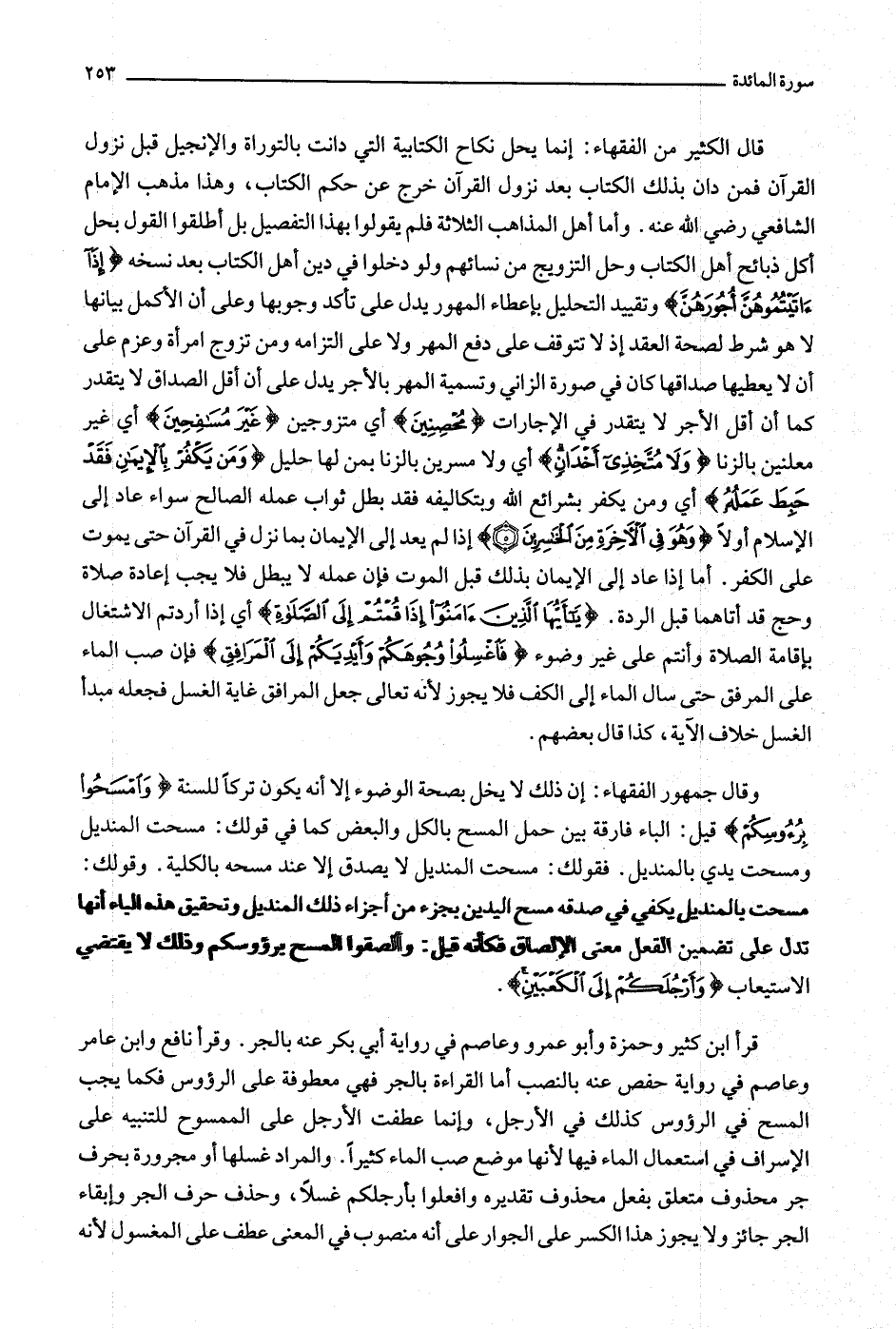 قال الكثير من الفقهاء: إنما يحل نكاح الكتابية التي دانت بالتوراة والإنجيل قبل نزول القرآن فمن دان بذلك الكتاب بعد نزول القرآن خرج عن حكم الكتاب، وهذا مذهب الإمام الشافعي رضي الله عنه. وأما أهل المذاهب الثلاثة فلم يقولوا بهذا التفصيل بل أطلقوا القول بحل أكل ذبائح أهل الكتاب وحل التزويج من نسائهم ولو دخلوا في دين أهل الكتاب بعد نسخه إِذا آتَيْتُمُوهُنَّ أُجُورَهُنَّ وتقييد التحليل بإعطاء المهور يدل على تأكد وجوبها وعلى أن الأكمل بيانها لا هو شرط لصحة العقد إذ لا تتوقف على دفع المهر ولا على التزامه ومن تزوج امرأة وعزم على أن لا يعطيها صداقها كان في صورة الزاني وتسمية المهر بالأجر يدل على أن أقل الصداق لا يتقدر كما أن أقل الأجر لا يتقدر في الإجارات مُحْصِنِينَ أي متزوجين غَيْرَ مُسافِحِينَ أي غير معلنين بالزنا وَلا مُتَّخِذِي أَخْدانٍ أي ولا مسرين بالزنا بمن لها حليل وَمَنْ يَكْفُرْ بِالْإِيمانِ فَقَدْ حَبِطَ عَمَلُهُ أي ومن يكفر بشرائع الله وبتكاليفه فقد بطل ثواب عمله الصالح سواء عاد إلى الإسلام أولا وَهُوَ فِي الْآخِرَةِ مِنَ الْخاسِرِينَ (5) إذا لم يعد إلى الإيمان بما نزل في القرآن حتى يموت على الكفر. أما إذا عاد إلى الإيمان بذلك قبل الموت فإن عمله لا يبطل فلا يجب إعادة صلاة وحج قد أتاهما قبل الردة. يا أَيُّهَا الَّذِينَ آمَنُوا إِذا قُمْتُمْ إِلَى الصَّلاةِ أي إذا أردتم الاشتغال بإقامة الصلاة وأنتم على غير وضوء فَاغْسِلُوا وُجُوهَكُمْ وَأَيْدِيَكُمْ إِلَى الْمَرافِقِ فإن صب الماء على المرفق حتى سال الماء إلى الكف فلا يجوز لأنه تعالى جعل المرافق غاية الغسل فجعله مبدأ الغسل خلاف الآية، كذا قال بعضهم.