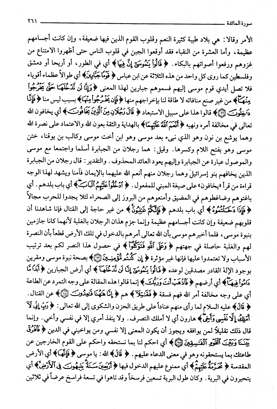 الأمر وقالا: هي بلاد طيبة كثيرة النعم وقلوب القوم الذين فيها ضعيفة، وإن كانت أجسامهم عظيمة، وأما العشرة من النقباء فقد أوقعوا الجبن في قلوب الناس حتى أظهروا الامتناع من غزوهم ورفعوا أصواتهم بالبكاء. قالُوا يا مُوسى إِنَّ فِيها أي في الطور، أو أريحا أو دمشق وفلسطين كما روى كل واحد من هذه الثلاثة عن ابن عباس قَوْماً جَبَّارِينَ أي طوالا عظماء أقوياء فلا تصل أيدي قوم موسى إليهم فسموهم جبارين لهذا المعنى وَإِنَّا لَنْ نَدْخُلَها حَتَّى يَخْرُجُوا مِنْها من غير صنع منافاته لا طاقة لنا بإخراجهم منها فَإِنْ يَخْرُجُوا مِنْها بسبب ليس منا فَإِنَّا داخِلُونَ (22) قالوا هذا على سبيل الاستبعاد قالَ رَجُلانِ مِنَ الَّذِينَ يَخافُونَ أي يخافون الله تعالى في مخالفة أمره ونهيه أَنْعَمَ اللَّهُ عَلَيْهِمَا بالهداية والثقة بعون الله والاعتماد على نصرة الله وهما يوشع بن نون وهو الذي نبىء بعد موسى وهو ابن أخت موسى وكالب بن يوقنا، ختن موسى وهو بفتح اللام وكسرها. وقيل: هما رجلان من الجبابرة أسلما واجتمعا مع موسى والموصول عبارة عن الجبابرة وإليهم يعود العائد المحذوف. والتقدير: قال رجلان من الجبابرة الذين يخافهم بنو إسرائيل وهما رجلان منهم أنعم الله عليهما بالإيمان فآمنا ويشهد لهذا الوجه قراءة من قرأ «يخافون» على صيغة المبني للمفعول. ادْخُلُوا عَلَيْهِمُ الْبابَ أي باب بلدهم. أي باغتوهم وضاغطوهم في المضيق وامنعوهم من البروز إلى الصحراء لئلا يجدوا للحرب مجالا فَإِذا دَخَلْتُمُوهُ أي باب بلدهم فَإِنَّكُمْ غالِبُونَ من غير حاجة إلى القتال فإنا شاهدنا أن قلوبهم ضعيفة وإن كانت أجسامهم عظيمة وإنما جزم هذان الرجلان بالغلبة لأنهما كانا جازمين بنبوة موسى، فلما أخبرهم موسى بأن الله تعالى أمرهم بالدخول في تلك الأرض قطعا بأن النصرة لهم والغلبة حاصلة في جهتهم وَعَلَى اللَّهِ فَتَوَكَّلُوا في حصول هذا النصر لكم بعد ترتيب الأسباب ولا تعتمدوا عليها فإنها غير مؤثرة إِنْ كُنْتُمْ مُؤْمِنِينَ (23) بصحة نبوة موسى ومقرين بوجود الإله القادر مصدقين لوعده قالُوا يا مُوسى إِنَّا لَنْ نَدْخُلَها أي أرض الجبارين أَبَداً ما دامُوا فِيها أي أرضهم فَاذْهَبْ أَنْتَ وَرَبُّكَ إنما قالوا هذه المقالة على وجه التمرد عن الطاعة أي على وجه مخالفة أمر الله فهم فسقة فَقاتِلا هم إِنَّا هاهُنا قاعِدُونَ (24) عن القتال.